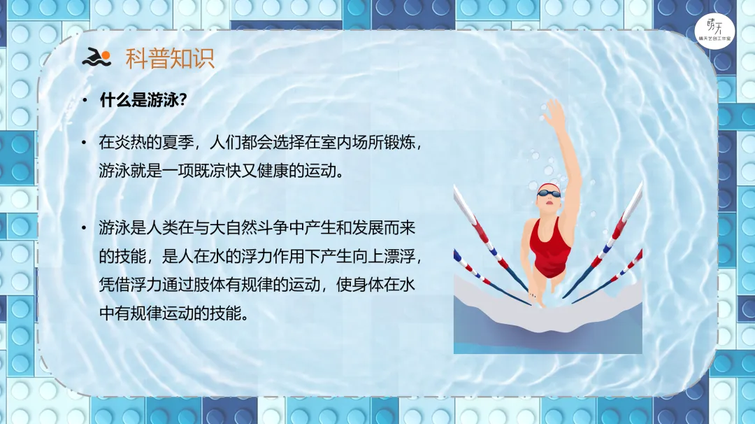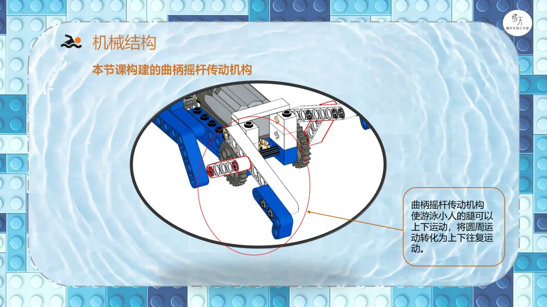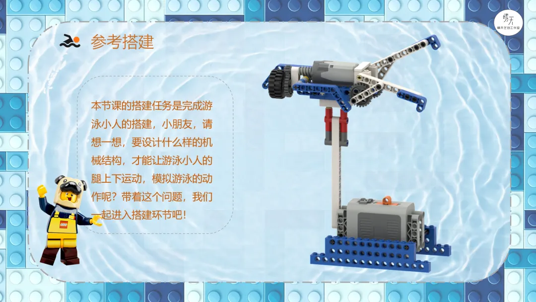 大家好,我是豆子老师。本篇文章向大家介绍的作品是《9686游泳》。①了解游泳这项运动,包括游泳的姿势以及需要注意的安全事项;②分析游泳小人的结构组成,思考要设计的机械结构,完成搭建;