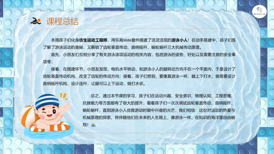 总之,通过本节课的学习,孩子们在运动兴趣、安全意识、物理认知、工程思维、抗挫能力等方面都有了很大的提升,看着孩子们一次次调试齿轮垂直传动、曲柄摇杆、蜗轮蜗杆,直到游泳小人优雅游动时眼中兴奋的光芒,我们相信:这份对运动的热爱与机械原理的探索,将伴随他们在未来的人生路上,像游泳一样,在知识的海洋里自由翱翔!🏊