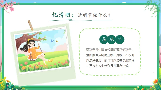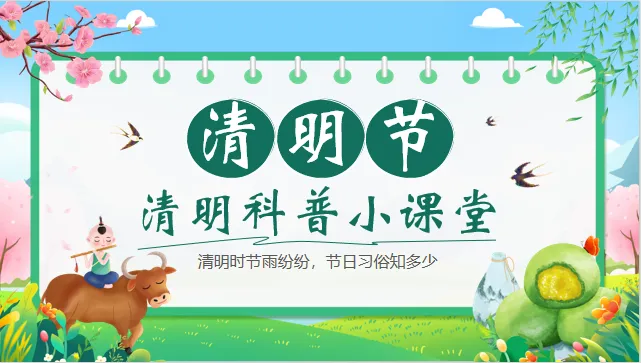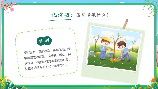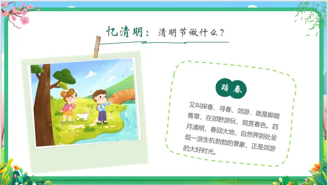 小结:清明节又叫“踏青节”,这时候天气变暖,花开了,草绿了,大家可以一起去户外感受春天的气息。