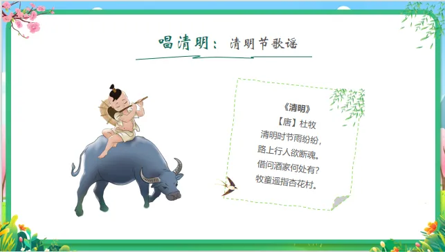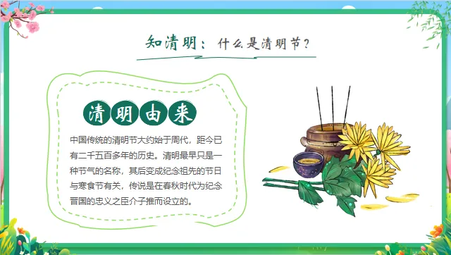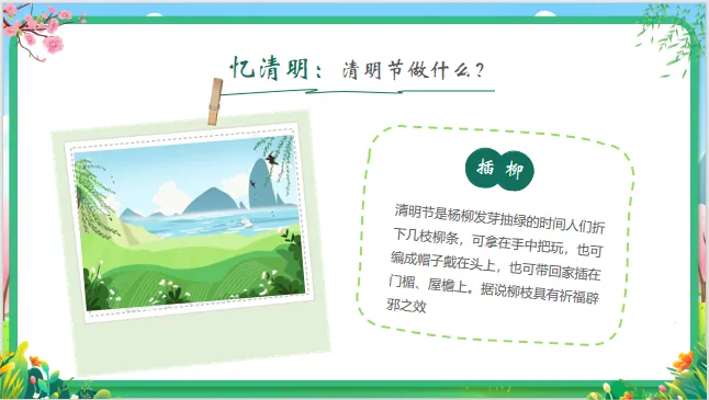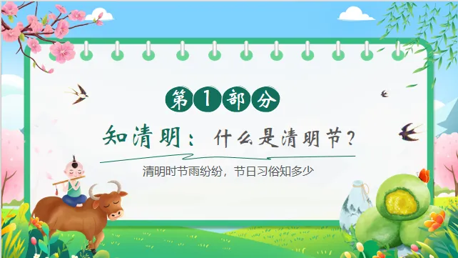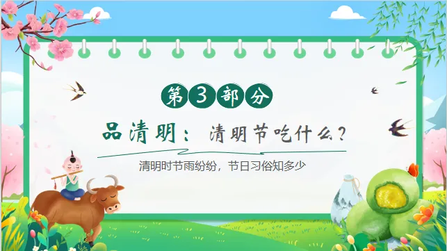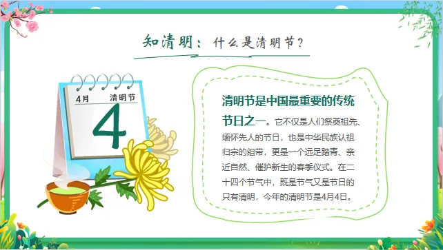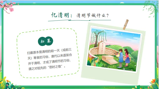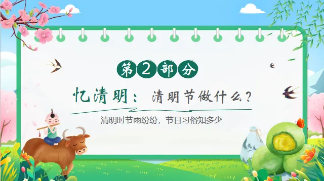 认知目标:知道清明节是中国的传统节日,了解清明节的大致日期(4月初)以及主要习俗(扫墓、踏青、吃青团)。