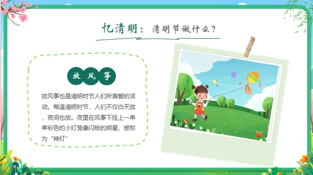 总结:清明节是一个既有思念,又有快乐(踏青、放风筝)的节日。我们要记得爱我们的家人,也要爱这美丽的春天。