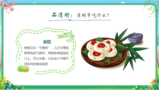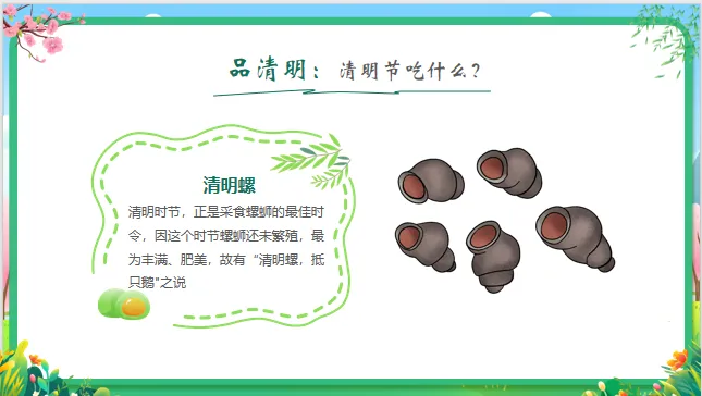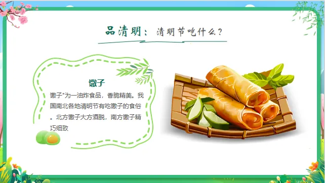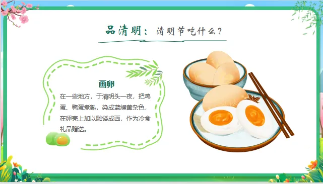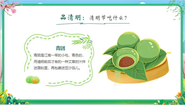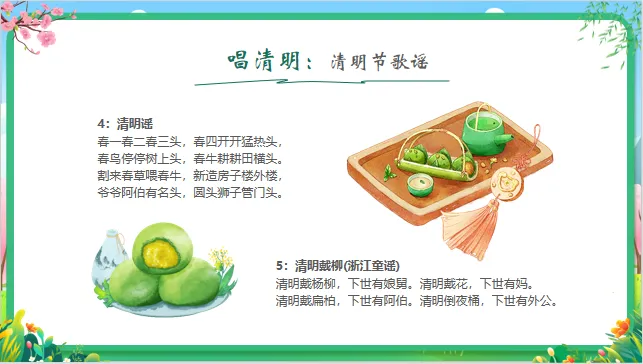 能力目标:能通过观察图片、倾听故事,简单复述清明节的1-2个习俗;尝试动手制作简单的“手工青团”或绘画春天。