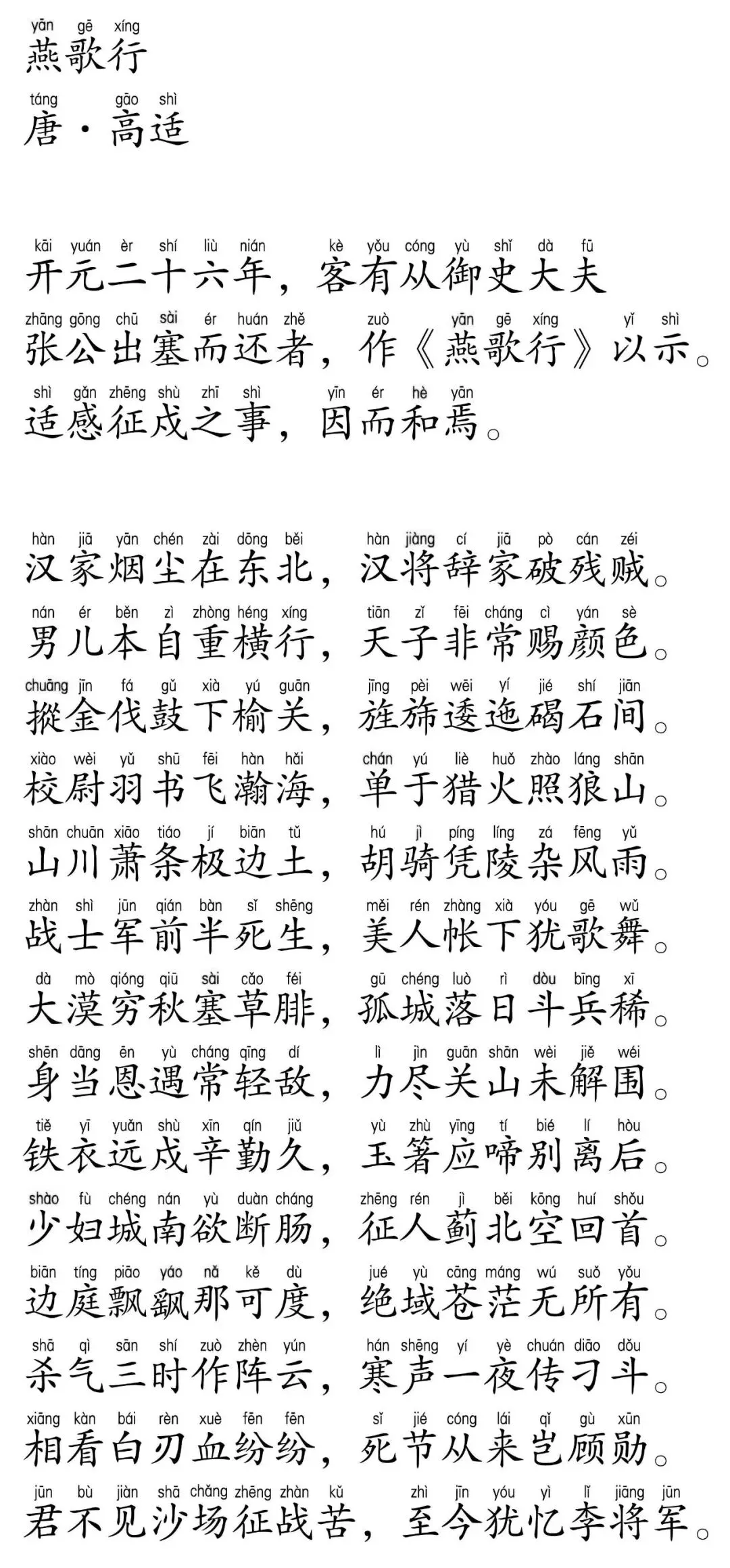 高适在创作此诗之前不久,曾经怀着豪情壮志,到蓟北一带漫游,寻求报效国家的机会。当时,那里正是唐朝与契丹对峙的前沿地区,形势紧张,是用人之地。由于当地军政官僚们堵塞贤路,高适的愿望无法实现,但他对边塞地区的现实状况是了解得更加具体、更加透彻了。这种切身的体验,也为《燕歌行》的写作提供了坚实的生活和思想基础。