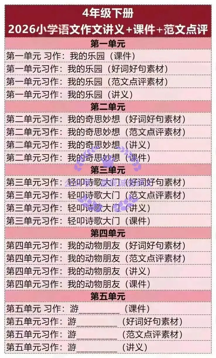 每个年包级含五个单元,阅读识及字,每个元单包含课件ppt,word讲义,范点文评素材word,好词好句素材word。