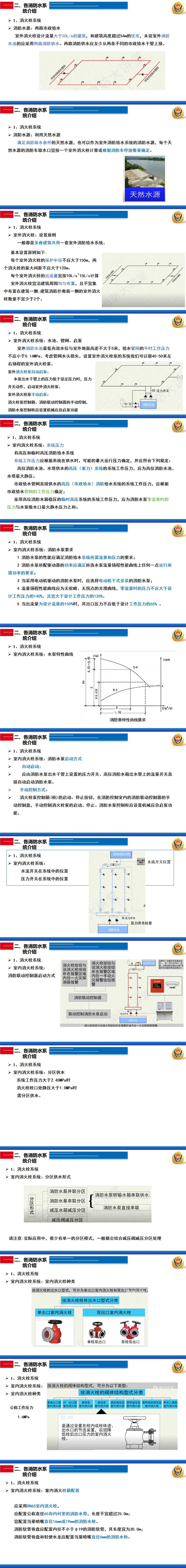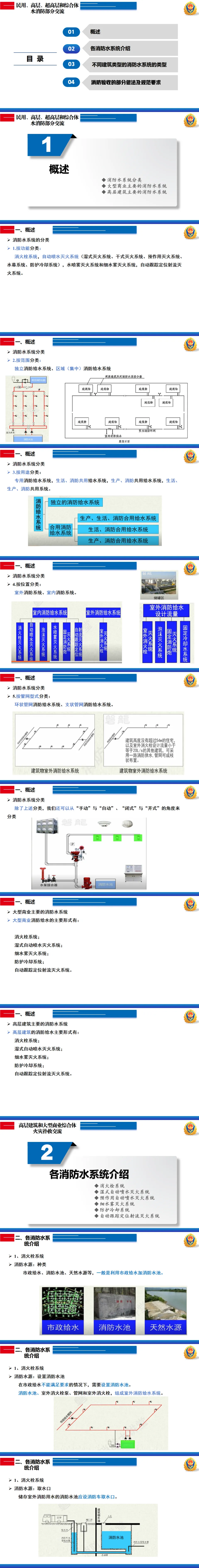 本课件介绍了各类消防水系统,不同高度建筑的消防水系统设计,以及消防验收的规范要求。