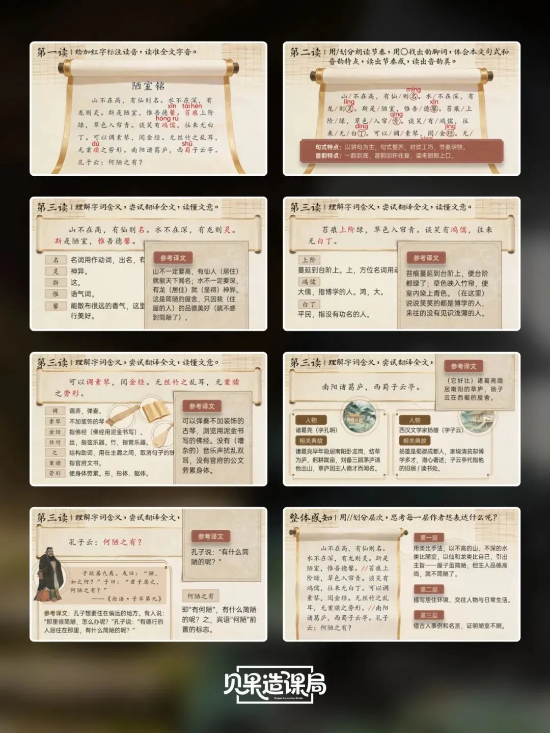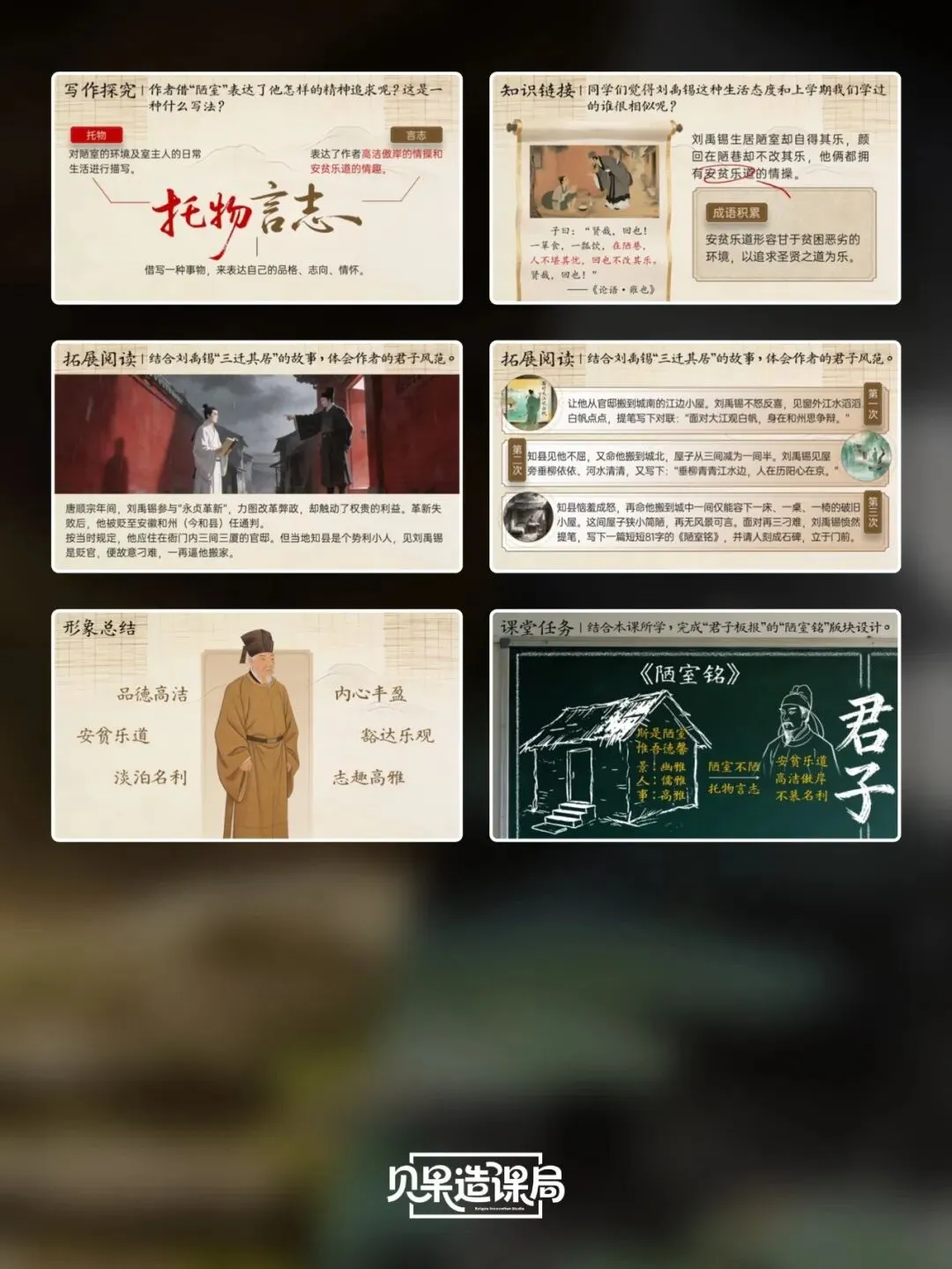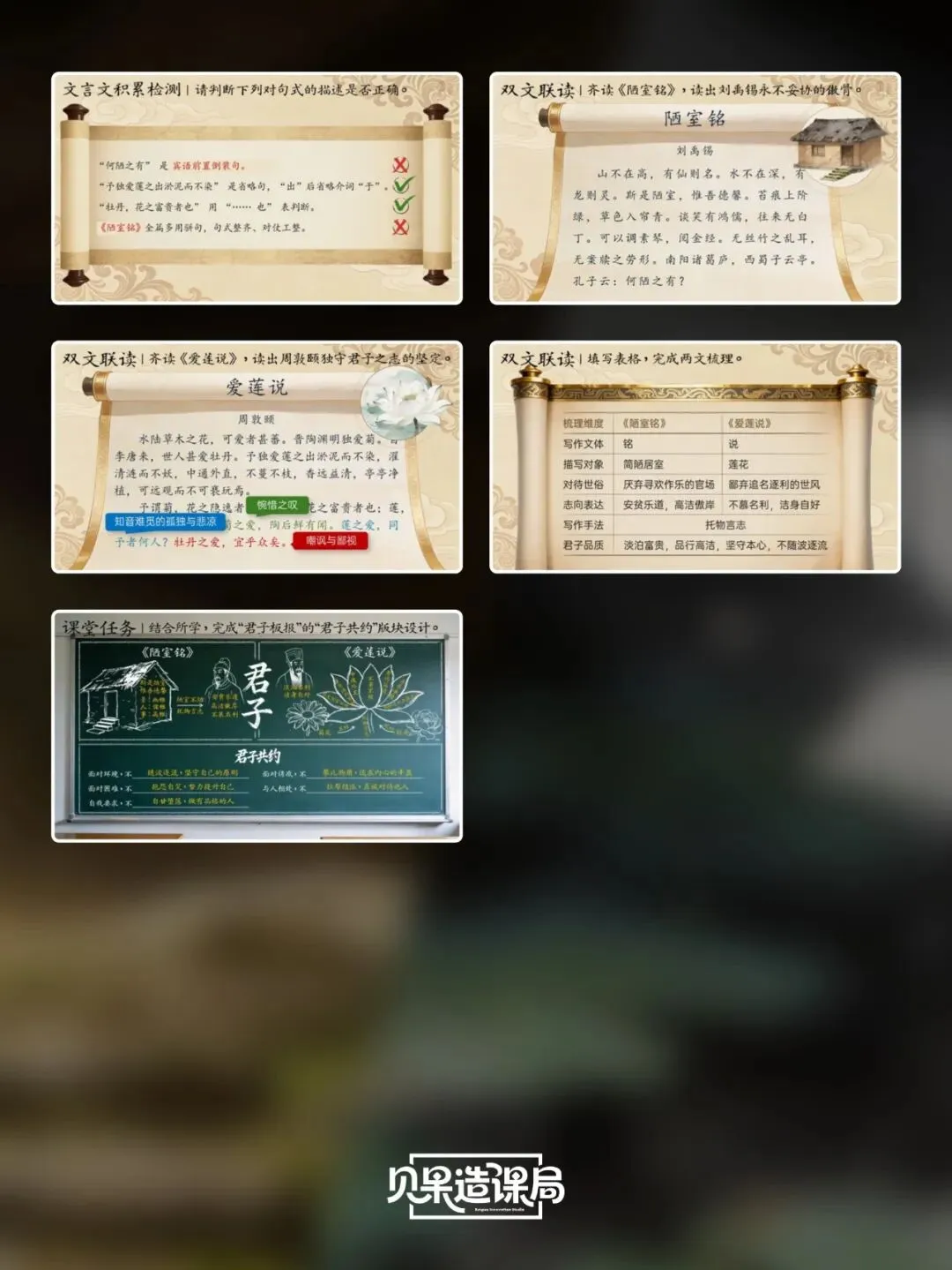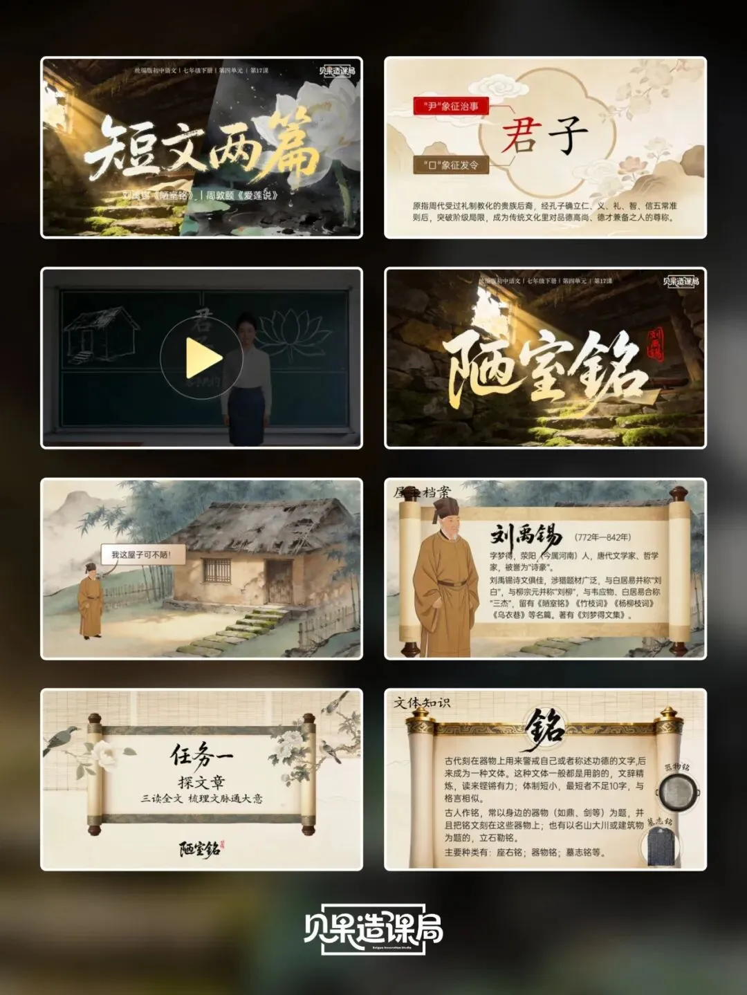 大家好~欢迎关注「贝果造课局」,今日分享统编版·七下语文第17课|《短文两篇》——《陋室铭》精品课件。本课情境设计:以学生设计“君子”主题板报为情境贯穿,课时1聚焦《陋室铭》,通过三读课文、情境开杠等环节理解刘禹锡安贫乐道的君子品格,完成板报《陋室铭》部分设计;课时2学习《爱莲说》,通过朗读课文、字词学习、花界论坛等环节,掌握莲花与君子的关联;最后双文联读、提炼共性,共同制定班级“君子共约”,完成最终板报设计,实现文言积累、文本理解与品德涵养一体化。(虚拟商品一经售出无法退换,请购前查看下方课件预览是否符合需求,购买方式在文章末尾)为感谢所有一直支持我们的粉丝朋友们,所有的商品均可扫码后先领券,新老客户可领取不同券额的优惠券!(如之前购买过我们课件,但没有领取老客优惠券成功的,可联系客服核对订单改价)点击我们课件商城→找到上方已购→点击已购商品→下拉找到资料模块即可下载。建议电脑下载,文件打开和编辑更方便哦~