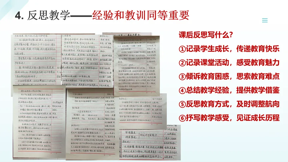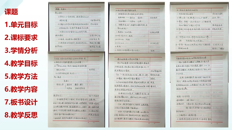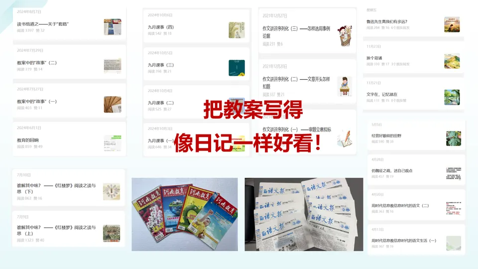 教案写出来了,课不一定如愿,个性的学生、动态的课堂,常常会有新生成,于是,上完课后再复盘,你会有不同的发现,这就是我教案上的另一部分内容,教学反思,我习惯叫教学后记。这是我不同时期的教学后记,或长或短,五花八门,后记记什么呢?我梳理了一下,大致有这些内容:①记录学生成长,传递教育快乐;②记录课堂活动,感受教育魅力;③倾诉教育困惑,思索教育难点;④总结教学经验,提供教学借鉴;⑤反思教育方式,及时调整航向;⑥抒写教学感受,见证成长历程。我也会把这些内容整理成电子文档,在公众号推送,我希望能惠及更多的同仁,有时也会挑选那么几篇去投稿,这些发表的文章多来源于教学反思,我的一个小愿望是:把教案写得像日记一样好看。