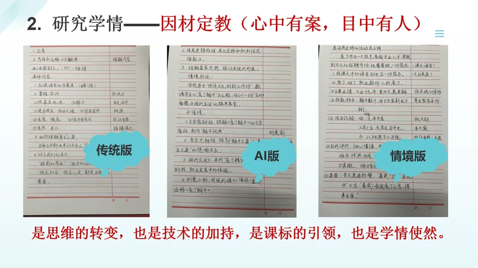 我备《庖丁解牛》时,写了三个不同的版本,为什么?当我依据传统的思路信手写就时,我对自己很不满意;就使用AI工具设计了一版,可是deepseek的设计华而不实,我没法照做,就梳理了一下有用的信息写就;最后,结合我们的实际学情,设计了情境版。