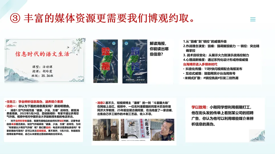丰富的媒体为我们源源不断地提供着资源,我们老师要博观约取。教材选择性必修(上)有一个活动单元——信息时代的语文生活,我在设计时从认识不同的媒介,到辨析信息真伪,再到学以致用,使用的材料有东部战区的视频、海报、动图,主流媒体的观点以及网友留言等,让学生感受到了新时代语文学习的重要性。