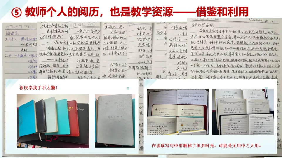 除此之外,我们教师的个人阅历,走过的路读过的书也是我们的教学资源,老师要善于借鉴和利用。这是我的读书笔记,很庆幸我不算太懒,在读读写写中消磨掉了很多时光,可能是无用中的大用。比如学习《记念刘和珍君》,当学生回答“我实在无话可说”蕴含的情感时,我可以很轻松地补充:“对于反马克思主义者,我们可以用马克思主义的真理反驳他,对于流氓无赖者,我只有保持沉默。”这句话就藏在我的某个笔记本上。
