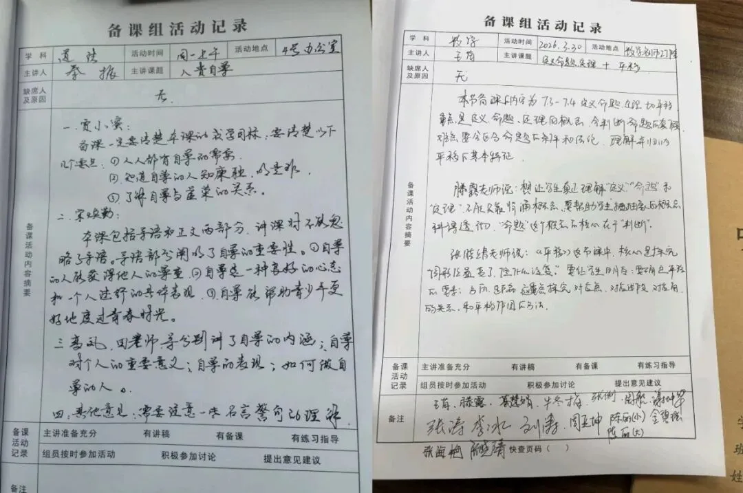 为保障教研质量,学校对集体备课实行“八定”闭环管理,做到有计划、有落实、有反馈: