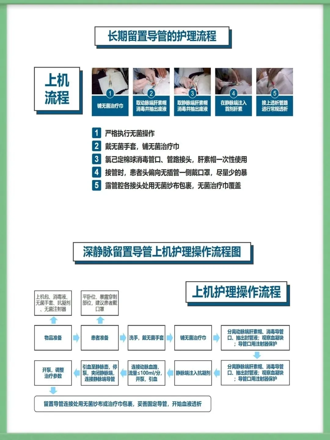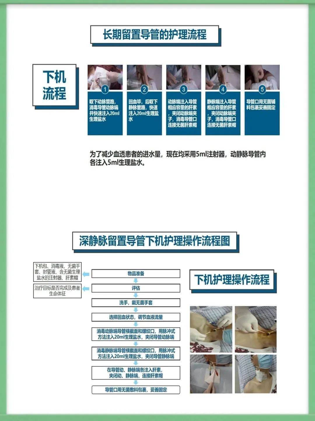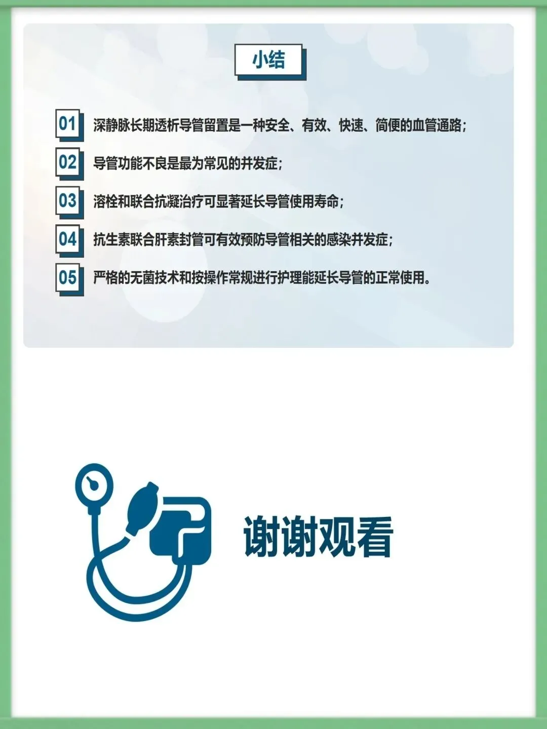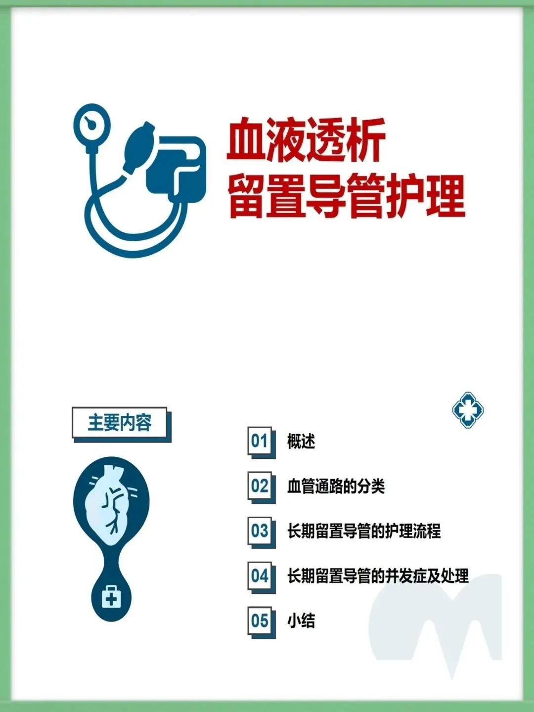 各位同仁,大家好。血液透析是肾功能衰竭患者核心替代治疗手段,血管通路为其“生命线”,带涤纶套深静脉留置导管作为永久性通路,兼具安全、速效、操作简便等优势,是临床重要选择。长期管相较临时管生物相容性更佳、感染率更低、血流量更高,颈内静脉为其首选置管部位。长期留置导管护理需严格遵循标准化流程,换药时需先评估导管固定及皮肤状况,再以>10cm范围无菌消毒,妥善覆盖敷料;上机与下机操作全程无菌,规范完成抽液、注药、封管等步骤,精准把控肝素与生理盐水使用剂量。导管护理的核心是并发症防控,临床常见感染、血流不畅、血栓、出血四类问题。感染分出口部、隧道、血源扩散性三类,需通过无菌操作、定期换药预防,确诊后针对性使用抗生素,严重时拔管。血流不畅多由导管塌陷、扭曲、贴壁或血栓导致,前三者可通过调整泵速、体位及导管位置缓解,血栓需在医生指导下采用尿激酶溶栓,无出血倾向者方可实施。出血因抗凝剂使用及血小板异常引发,以局部压迫冷敷止血为主,必要时拔管。规范的无菌操作与标准化护理是延长导管使用寿命的关键,抗生素联合肝素封管、溶栓与抗凝联合治疗,能有效降低并发症发生率。长期留置导管作为安全有效的血管通路,精准护理可为血液透析顺利开展筑牢基础,保障患者治疗效果与安全。