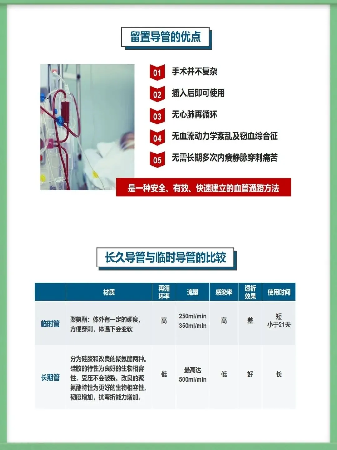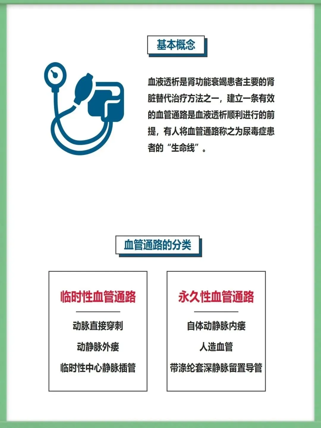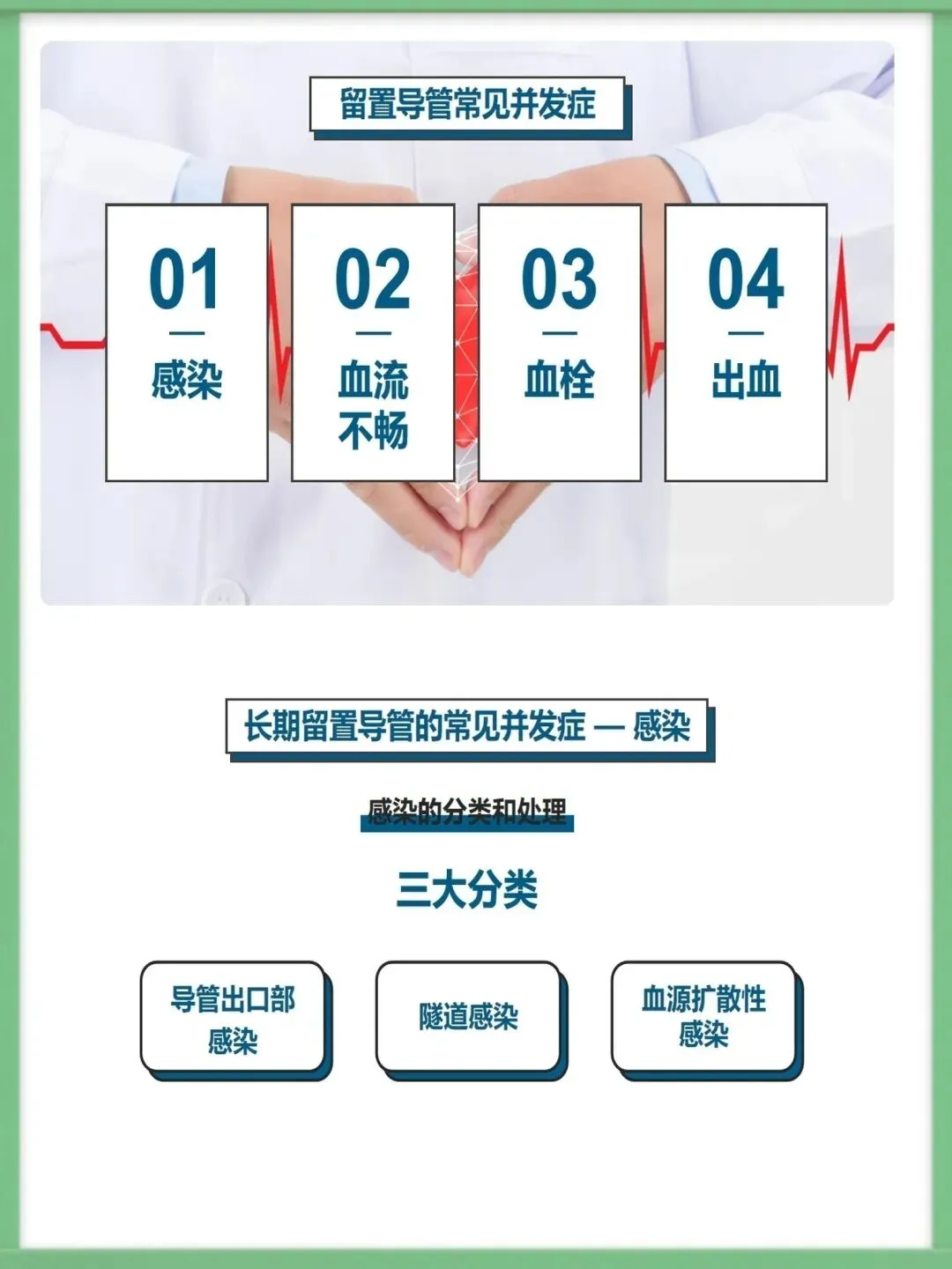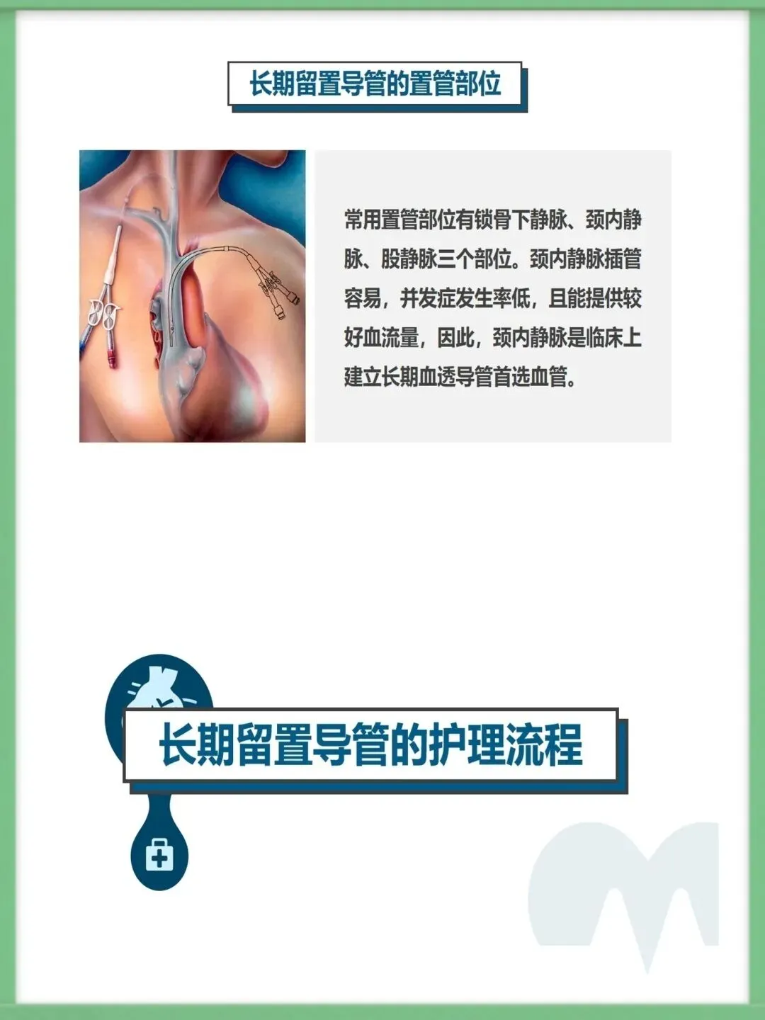 各位同仁,大家好。血液透析是肾功能衰竭患者核心替代治疗手段,血管通路为其“生命线”,带涤纶套深静脉留置导管作为永久性通路,兼具安全、速效、操作简便等优势,是临床重要选择。长期管相较临时管生物相容性更佳、感染率更低、血流量更高,颈内静脉为其首选置管部位。长期留置导管护理需严格遵循标准化流程,换药时需先评估导管固定及皮肤状况,再以>10cm范围无菌消毒,妥善覆盖敷料;上机与下机操作全程无菌,规范完成抽液、注药、封管等步骤,精准把控肝素与生理盐水使用剂量。导管护理的核心是并发症防控,临床常见感染、血流不畅、血栓、出血四类问题。感染分出口部、隧道、血源扩散性三类,需通过无菌操作、定期换药预防,确诊后针对性使用抗生素,严重时拔管。血流不畅多由导管塌陷、扭曲、贴壁或血栓导致,前三者可通过调整泵速、体位及导管位置缓解,血栓需在医生指导下采用尿激酶溶栓,无出血倾向者方可实施。出血因抗凝剂使用及血小板异常引发,以局部压迫冷敷止血为主,必要时拔管。规范的无菌操作与标准化护理是延长导管使用寿命的关键,抗生素联合肝素封管、溶栓与抗凝联合治疗,能有效降低并发症发生率。长期留置导管作为安全有效的血管通路,精准护理可为血液透析顺利开展筑牢基础,保障患者治疗效果与安全。