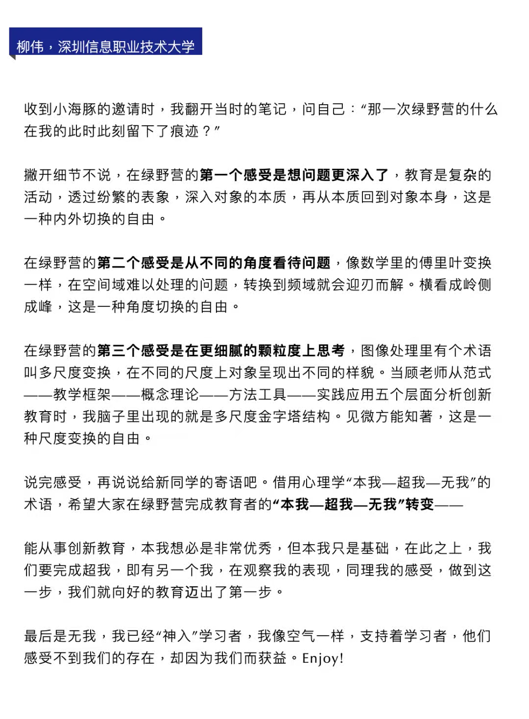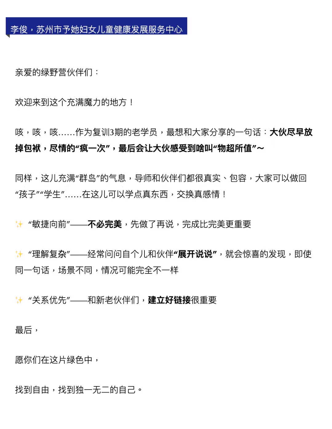 一旦我们能够深刻理解并落实在具体的教学设计里,我们就能够灵活而又综合地应用各种已有的教学法和教学技巧,并且有能力不断创造出符合自己的教育理念和教学场景的新的教学设计和教学技巧。“绿野营”的全称是“教育3.0教学设计实战共研营”,这个名称中的每一个词都是有意义的。- “教育3.0”是区别于传统学校教育的教育新范式,我们要进行的“教学设计”是在这一范式下进行的。- 之所以叫“教学设计”而不是“课程设计”,是因为学习远远不止是在课堂上发生,助力学习的也远远不止是设计一门课程。在教育3.0的范式下,教和学是一种全流程的体验,是一件错综复杂的事情。- “实战共研”指的是基于伙伴们自身真实的教学案例和原先有所困扰的设计思路,进行细致的反馈和讲解;通过实战研讨和共同教研,形成一个跨团队的教学设计智慧房间。- 连“营”这个字也不是随便用的。为什么不用“班”呢?想想看“班”带给我们头脑中的意向会是什么,而“营”带给我们的感受又是什么?让好的学习发生,首先基于教育底层范式的转化 —— 从被动僵化的教育1.0范式,转向鼓励学生以更加灵活多样和协作式学习的教育2.0范式,并向着“自由探索、自主创造、自我构建” 的教育3.0范式不断进化。 —— 底层范式决定了我们在采取具体教育行动时的基本理念和设计思路。由此,我们需要对学习的基本理念转变—— 一场好的学习,在形态和本质上应该是符合社会化学习理念的,本质上围绕三条宗旨 “学习在窗外、他人即老师、世界是教材” 。即:让学习者拥有“学习在窗外”的权利,提升“他人是老师”的能力,也就自然启动了学习者们主动拉取“世界成为教材” 的动力。 那么,如何基于教育3.0的范式进化,设计出一系列的学实践并在不同的场景里予以灵活用,从而实现社会化学习的理念和型态呢? ——围绕“关系优先-敏捷向前-理解复杂” 三根设计支柱,重新定义、理解和实践我们的教学设计。 在绿野营里,我们将围绕教育3.0教学设计的三根支柱,帮助每位伙伴体会重要的运作机制,掌握核心的设计模块,包括:模块一『何为关系』:教学设计中的“关系”绝不只是“师生关系”那么简单,如何让教学内容和学习者产生关联?如何让学习的场域和学习者建立关系,并成为教学设计的素材?如何生成一个有效的学习共同体?……模块二『自主学习的四个阶段』:我该如何识别学习者当下所处的阶段和状态?我该如何支持学习者走向自主学习的下一个阶段?如何支持学习体验中学习者的自我反思?……模块三『共学设计』:一群人在一起学习就是“共学”吗?共学的机制、方法,和技巧。不同教学场景和教学主题下的共学设计;如何支持学习者围绕学习内容,建构其自己的“意义之网”,并在和其他学习者的共学共创中,构建出一个“智慧房间”?……模块四『如何做“全流程(BDA)的教学设计”』,使教学超越特定的时空限制,变成一场“无限的游戏”?模块五『学习从“最小全局认知”开始』:为什么“最小全局认知”对学习体验如此重要?如何在不同教学场景中灵活有效地设计出一个“最小全局认知”的学习体验?如何基于“最小全局认知”推动教学设计,以便使学习者在学习之旅开启之时便能够对未来的学习体验形成整体性的感知,既能够激发学习者的学习热情和兴趣,也成为教育者做进一步教学设计的参考?……模块六『教学的母题和目标』:如何让教学的内容和学习者建立联结,如何让教学支持到学习者回应他们在真实世界里遇到的真实的问题和挑战?一门课、一门学科究竟在教的是什么?教学设计的北极星、设计原则,和限制条件是什么?教学目标的四个维度及其在教学中的体现……模块七『教学内容的“鸡尾酒”设计』——在教学设计中如何把“information、conformation、transformation”三种教学目标做出有效而具创造性的组合?如何通过复盘来迭代教学内容、支持学习者的自我发现?……模块八『如何设计参与式评估』:如何让学习者参与对自身学习成果和过程的评估?如何通过阶段性的复盘迭代,既支持学习者在学习内容上的收获,也支持学习者学会学习,并在学习体验中建构自我?……) — 认为自己是一位教育者;(在群岛,我们对“教育者”的界定不是体制内外或是专职与否的身份,而是看这个人如何看待教育、如何理解孩子、如何助力成长)— 认可「教育3.0」的教育新范式并对相关理念有所了解 (包括但不限于:读过《教育3.0》、阅读过群岛大学相关文章、观看过群岛系列教育纪录片、参加过群岛大会或各类线上线下活动、学习过群岛大学系列课程…...);— 希望在自己的教育探索中导入「社会化学习」的理念;— 有一定的教学设计和实施的经验(不论是你觉得满意的还是不尽如人意的,重要的是真实的实践);— 乐于分享,享受共学共创的乐趣(鼓励你带着自己的教学设计来学习);很多小伙伴会在后台询问,“「群岛教学设计绿野营」是什么样的?有没有详细的课程安排?”熟悉群岛的伙伴都知道,群岛的课程没有PPT,没有课程表,是随着学习现场而时时迭代流动的。这样的课堂对很多第一次接触群岛伙伴来说或许有些难以想象,所以小海豚邀请了「绿野营」的往届学友们来分享一些他们的学习感受,也是他们给新一期学友们写下的寄语。☜左右滑动查看更多