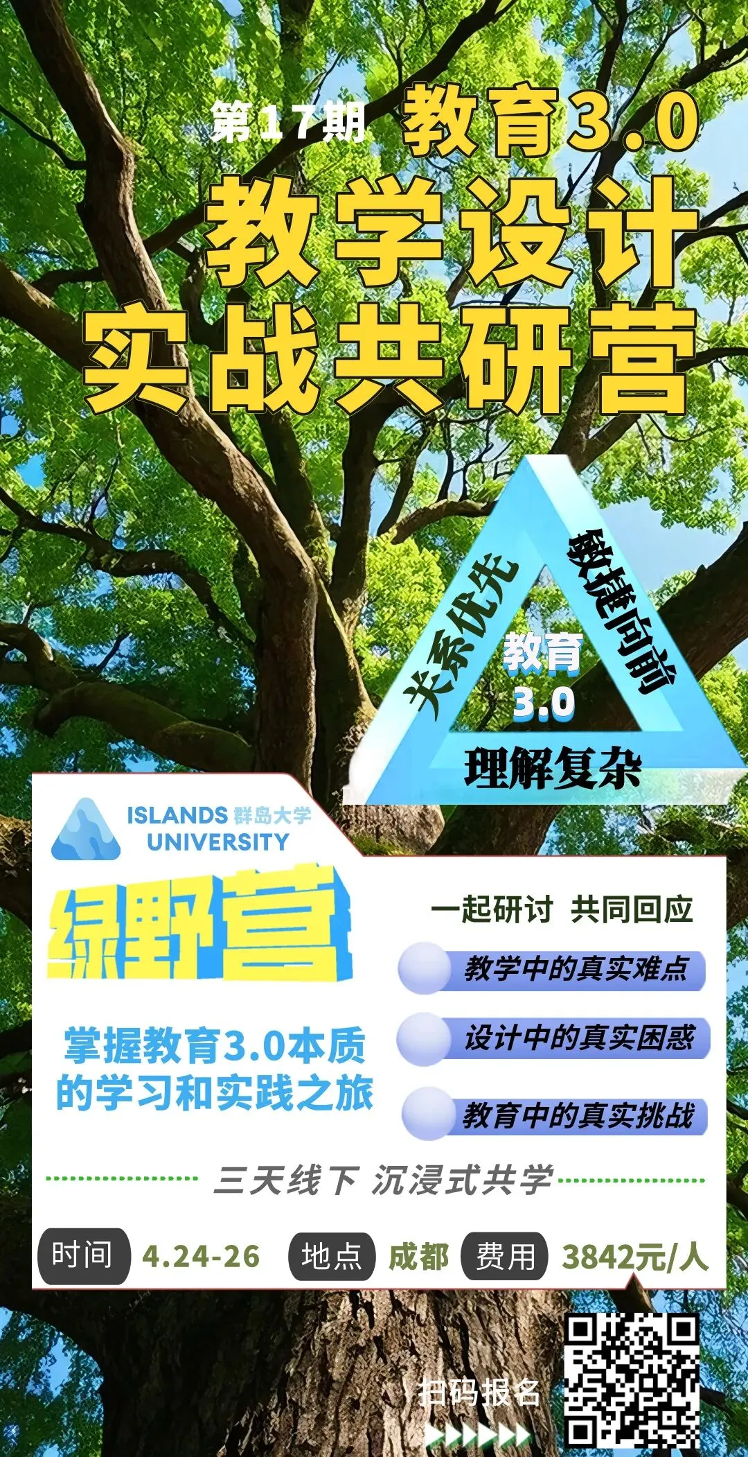 4月24日15:00-21:00;25日9:00-20:00;26日9:00-18:001.4月10日前付款锁定名额,可享500元早鸟优惠;2. 为了支持大家更好地在机构内落地实践,群岛鼓励同一个教学设计团队的多位伙伴共同参与学习,因此同一个教学设计团队如果有2位及以上同事一起报名,每位可享9折团队价;3. 欢迎绿野营往期校友复修,享复修价2,542元。 教育创新是一条不容易走的路,我们希望通过记录并分享教育创新者在通往教育3.0过程中的观察、实践和思考,让读者从中获得前行的动力、思维的碰撞和实践的启发。