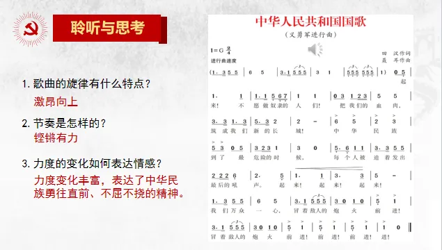 2.欣赏国歌音频,引导学生从旋律、节奏、力度等方面进行审美感知。