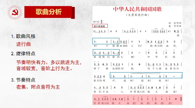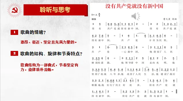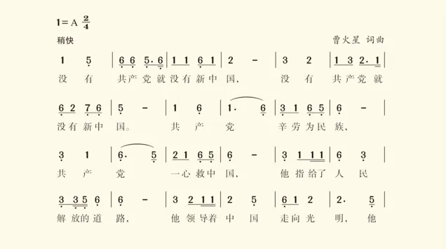 师补充:在节奏方面,它采用了2/4节拍,这种节拍的特点是强弱交替明显,给人一种稳定、坚定的感觉,很适合表达这首歌所要传达的主题和情感。在旋律方面,该歌曲吸取了民间歌舞“霸王鞭”(霸王鞭是一种民间舞蹈形式,集舞蹈、武术、体育于一身,节奏明快,粗扩豪放,铿锵有力)的音调特点,旋律线条简单,起伏不大,通过简单的变化和重复,增强了歌曲的感染力和记忆力。同时,旋律的上行进行在每个乐句的尾音处,突出了“没有共产党就没有新中国”的主题。