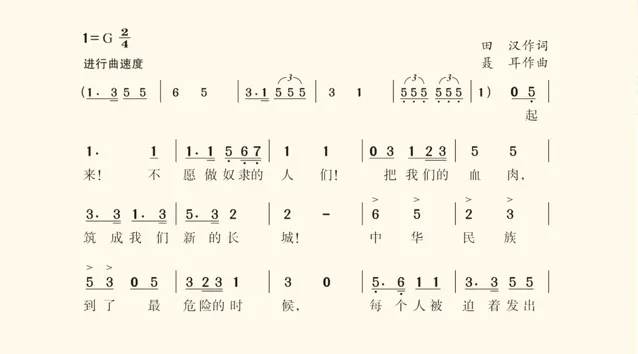 师:《义勇军进行曲》诞生于中华民族生死存亡的关头。20世纪30年代,日本帝国主义加速了侵华的步伐。1931年“九一八”事变,拉开了日本帝国主义侵华的序幕,“不作亡国奴”的吼声唤起了全国人民高昂的爱国热忱。1934年春,田汉决定写一个以抗日救亡为主题的电影剧本。在他刚完成一个故事梗概和一首主题歌的歌词时,就被国民党反动派逮捕入狱。另一位共产党员、戏剧家夏衍接手将这个故事写成了电影剧本。聂耳主动要求为田汉写就的主题歌《义勇军进行曲》谱曲。当他读到歌词“起来!不愿做奴隶的人们!把我们的血肉,筑成我们新的长城!中华民族到了最危险的时候,每个人被迫着发出最后的吼声。起来!起来!起来!我们万众一心,冒着敌人的炮火前进!冒着敌人的炮火前进!前进!前进!进!”时,仿佛听到了母亲的呻吟、民族的呼声、祖国的召唤、战士的怒吼,爱国激情在胸中奔涌,很快就完成了曲谱初稿,后来又在躲避国民党政府追捕的颠沛流离中完成了曲谱定稿。