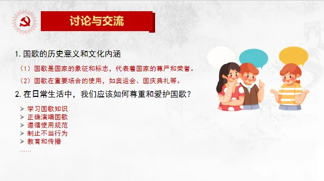 (1)提问:在日常生活中,我们应该如何尊重和爱护国歌?