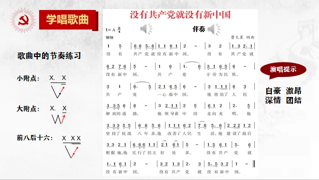 1.学生能够熟练演唱歌曲《没有共产党就没有新中国》,并准确把握歌曲的节奏、旋律和情感。