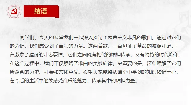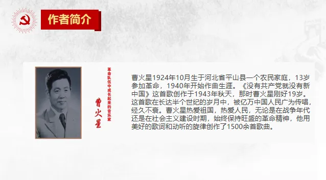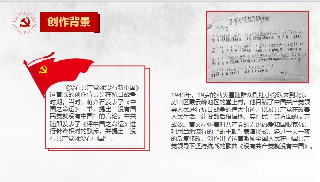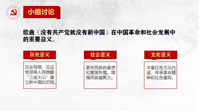 师:同学们,我们刚刚深入了解并唱响了激昂澎湃的《中华人民共和国国歌》,感受到了它所蕴含的伟大力量和民族精神。而在中国的发展历程中,还有一首歌曲同样具有深远的意义,那就是《没有共产党就没有新中国》。让我们一同走进这首歌,去探寻它背后的故事和力量。(接导入部分)