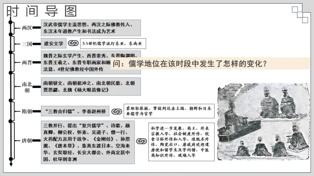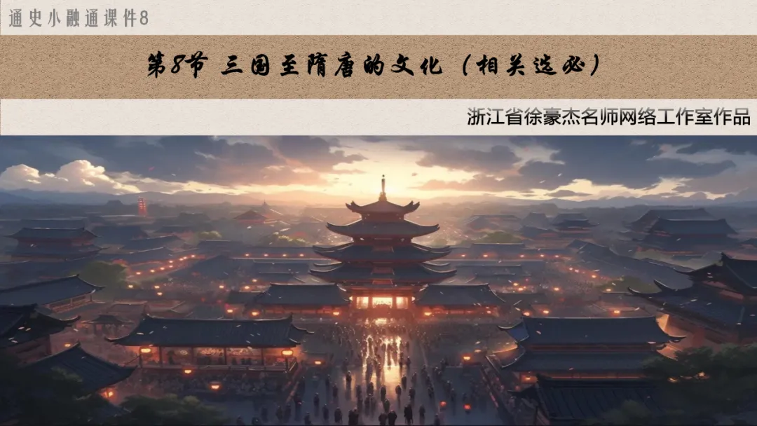 编者按:浙江省徐豪杰名师网络工作室集全室之力编写的选考复习教辅用书——《睛点书理•通史小融通》已经通过浙江省中小学教辅材料评议委员会专家组评议,入选浙江省教育厅教辅评议目录,由新华书店发行(新华目录序号:上册6694;下册6695)。本套教辅原有配套课件由南太湖团队精心制作(甲件),现本工作室正制作全新一套配套课件(乙件),陆续上传分享在工作室网站上(路径:工作室网站——教学资源——工作室开发的通史小融通)。本期推出由杭州师范大学附属中学汤雨曦老师制作的乙件第8个课件《第8节 三国至隋唐的文化(相关选必)》。