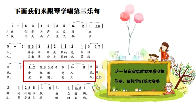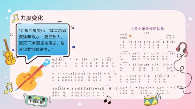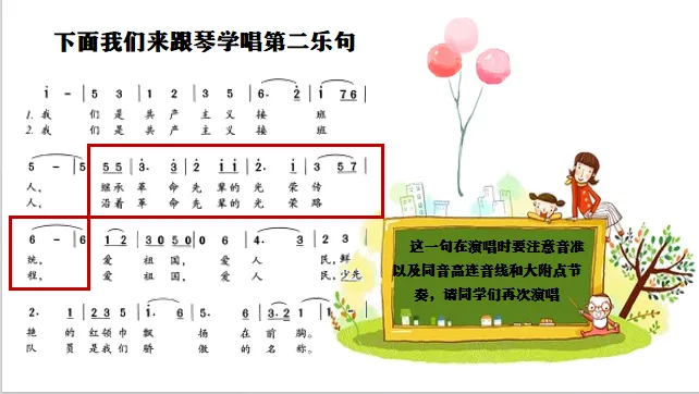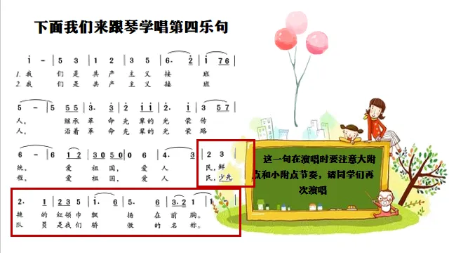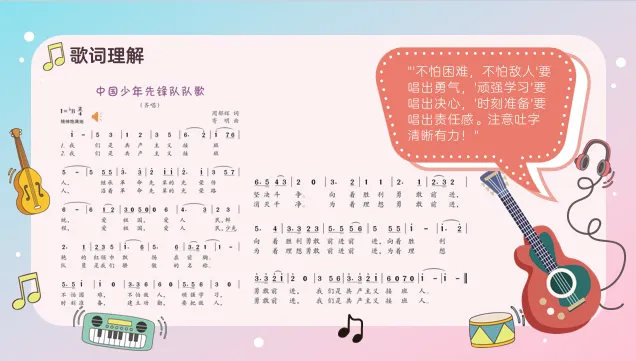 教师语言:"学唱主题旋律:情绪要唱得坚定有力,旋律要注意音准。要唱出少先队员的豪迈气概!"