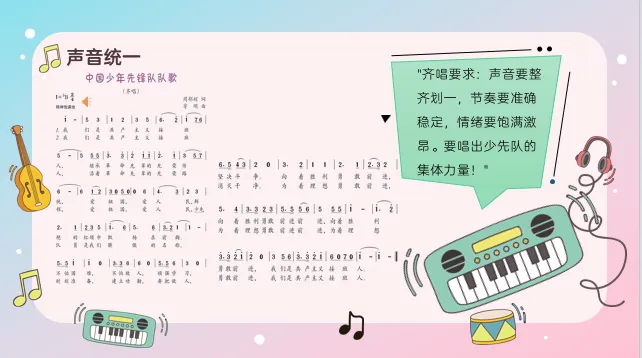 教师语言:"齐唱要求:声音要整齐划一,节奏要准确稳定,情绪要饱满激昂。要唱出少先队的集体力量!"