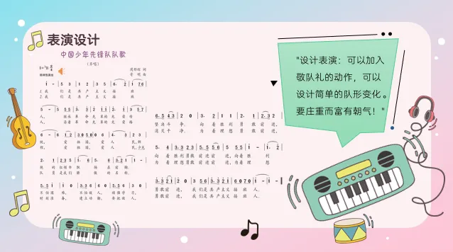 教师语言:"设计表演:可以加入敬队礼的动作,可以设计简单的队形变化。要庄重而富有朝气!"