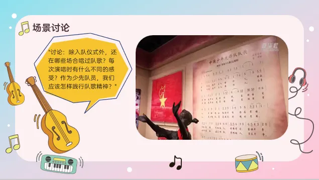 教师语言:"讨论:除入队仪式外,还在哪些场合唱过队歌?每次演唱时有什么不同的感受?作为少先队员,我们应该怎样践行队歌精神?"