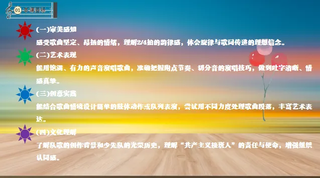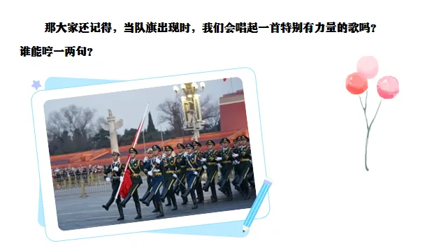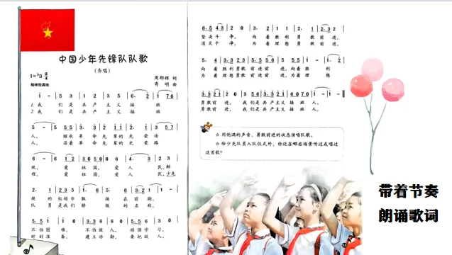 教师语言:"同学们,请看这幅庄严的画面:鲜艳的队旗迎风飘扬。作为少先队员,我们要用最饱满的精神来学唱这首属于我们自己的歌曲!"