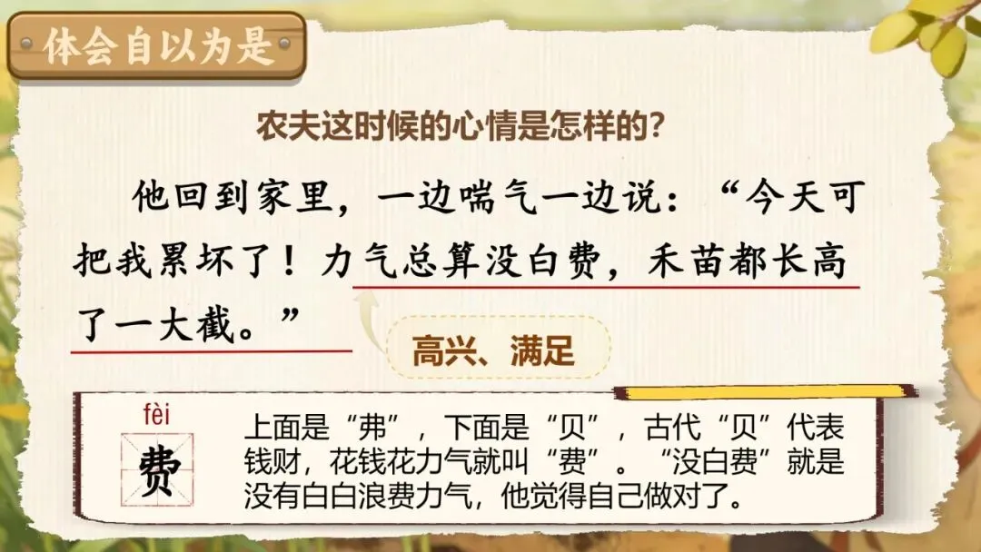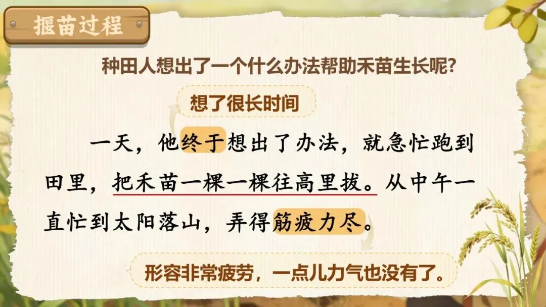 师:对!禾苗有自己的生长规律。禾苗的成长,需要农民伯伯经常给它们锄草、施肥、浇水、除虫。这个农民太心急了,把禾苗强行拔高会把禾苗的根拔断,禾苗无法靠根吸收营养,最后就枯死了。这就叫——
