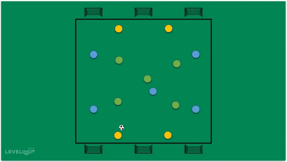 目标:如果控球队与中立球员在不丢球的情况下完成18次传球,他们可以在任何一个小球门完成进攻。