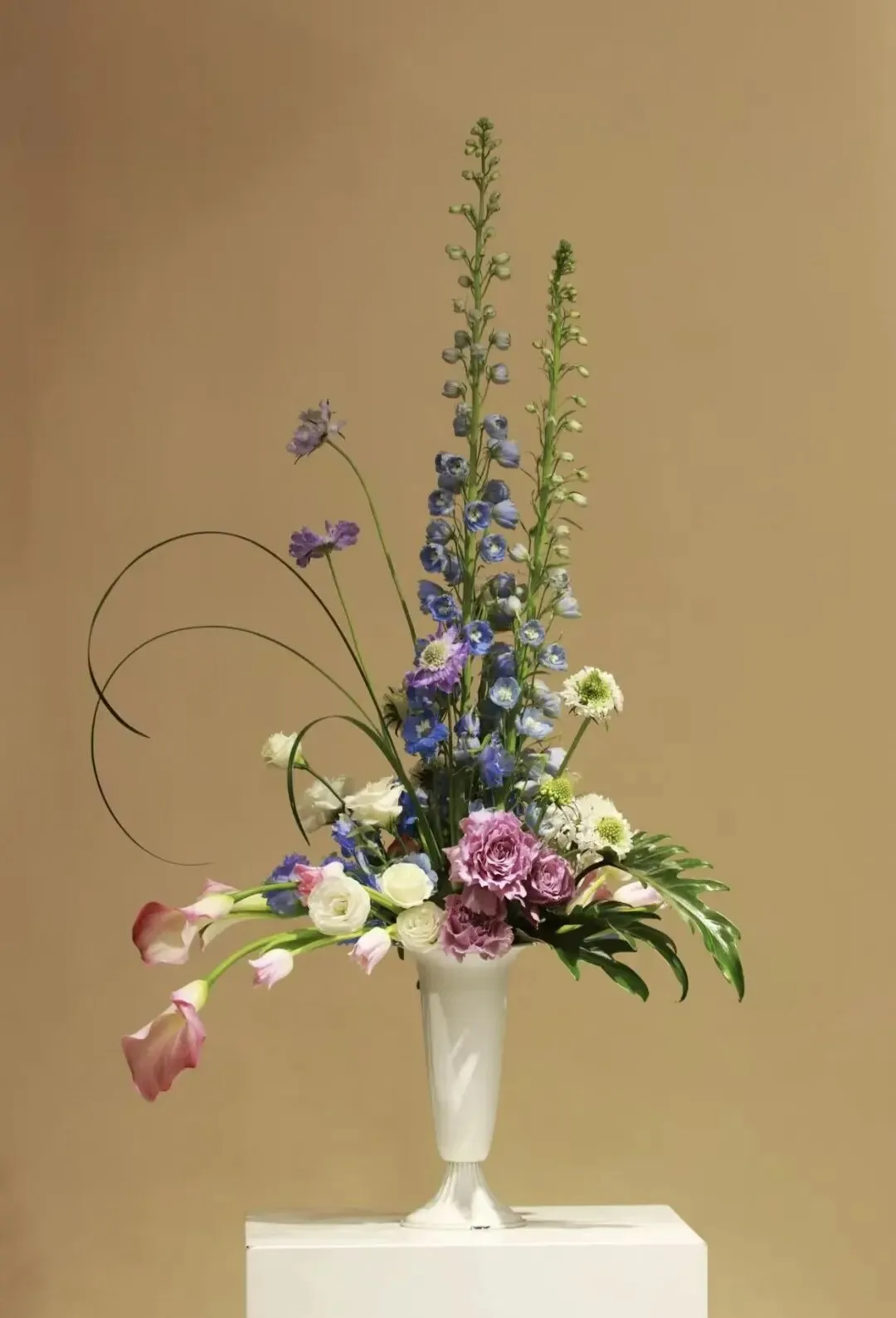 这是最沉稳的古典结构,如鼎如钟。最高一枝为主峰,奠定气韵之巅;左右两枝为侧岭,形成安稳的基座。所有花材在此框架内生长,最终呈现稳定、庄严、不可撼动的仪式感。它诉说着一种恒久的守望与不变的尊崇。心法在于:定点,连线,成面。 这是初心的修炼,规矩中见力量
