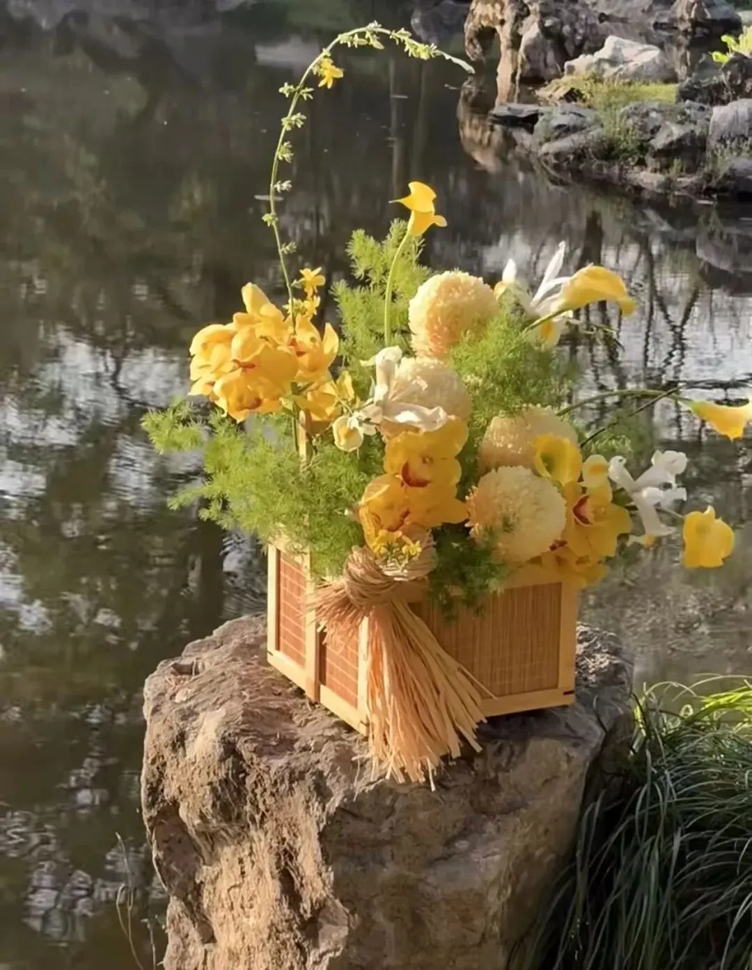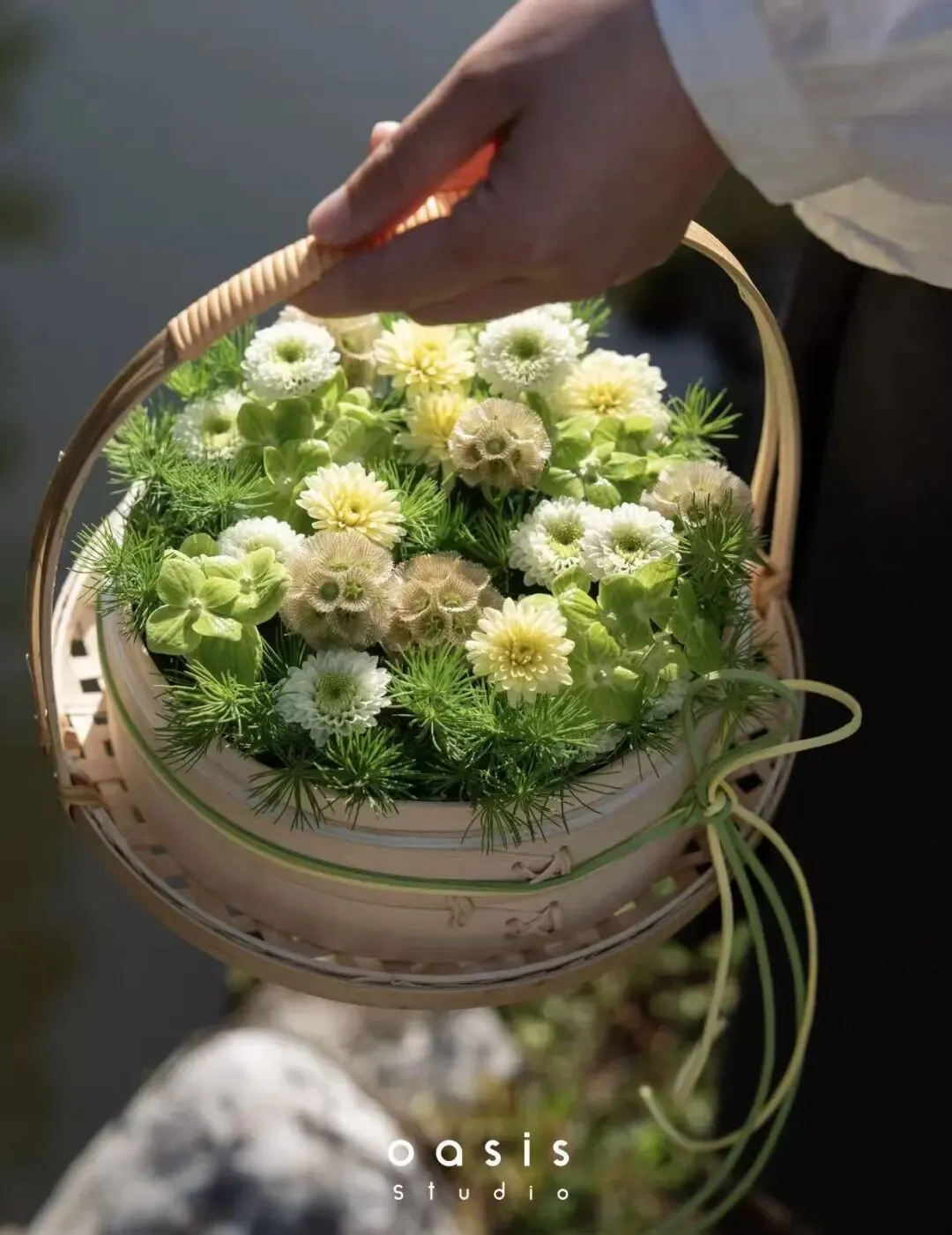 此法最高,也最难。它摈弃人造的对称,直追草木在山野间的本真姿态。一高一低,一俯一仰,一枯一荣,皆顺势而为。仿佛这篮花不是被“插”成,而是自己从篮中“生”长出来。它追求的是不齐之齐,不工之工,是“虽由人作,宛自天开”的至高境界。心法在于:读解花材的表情,顺应天然的势态,与花对话