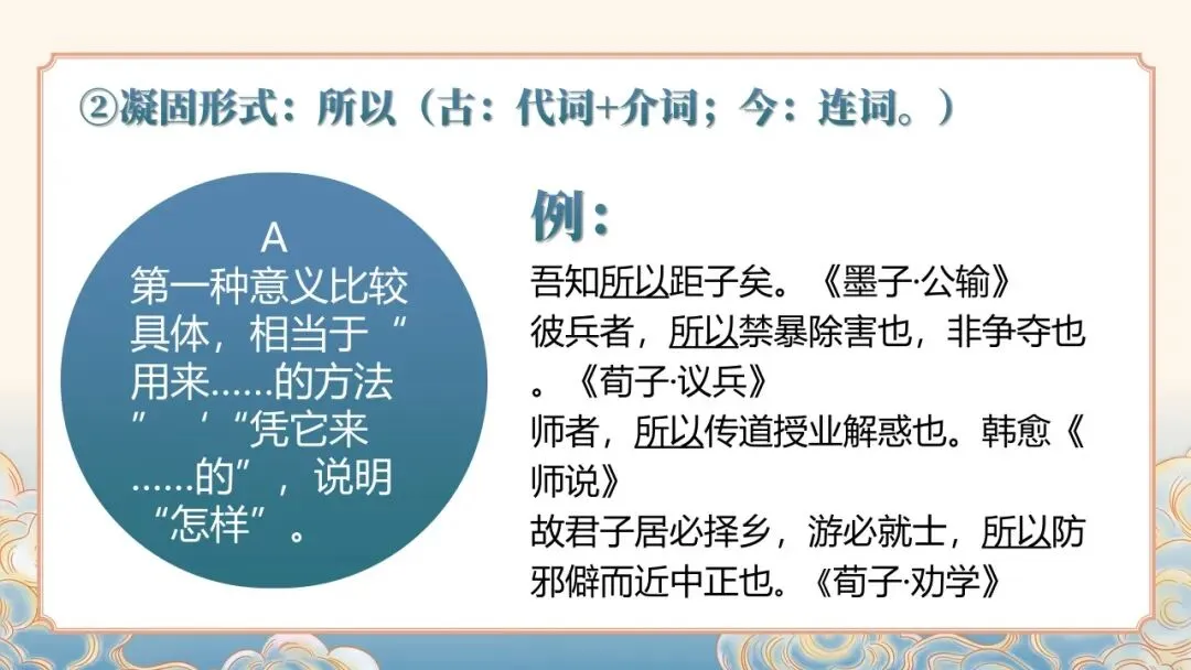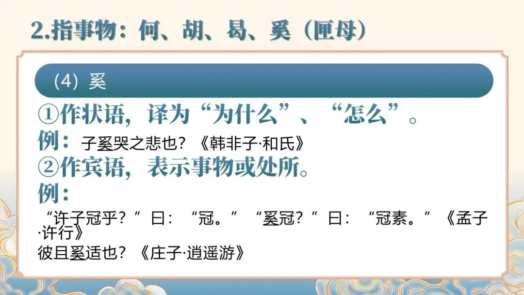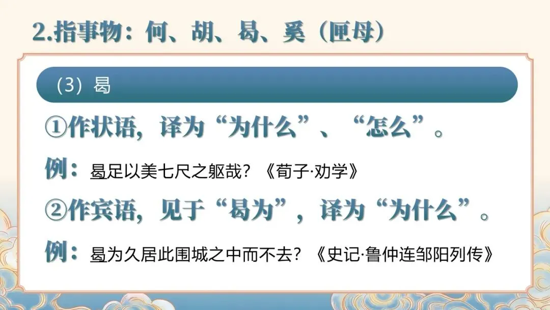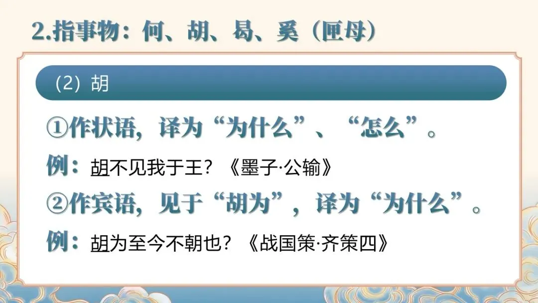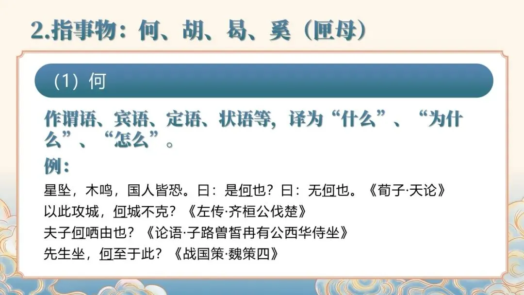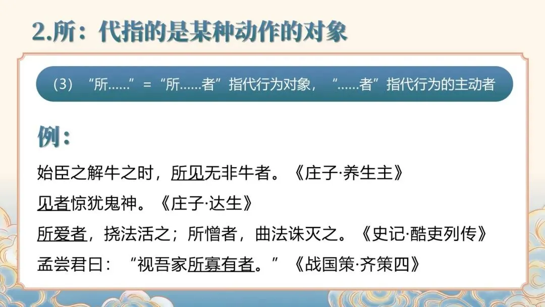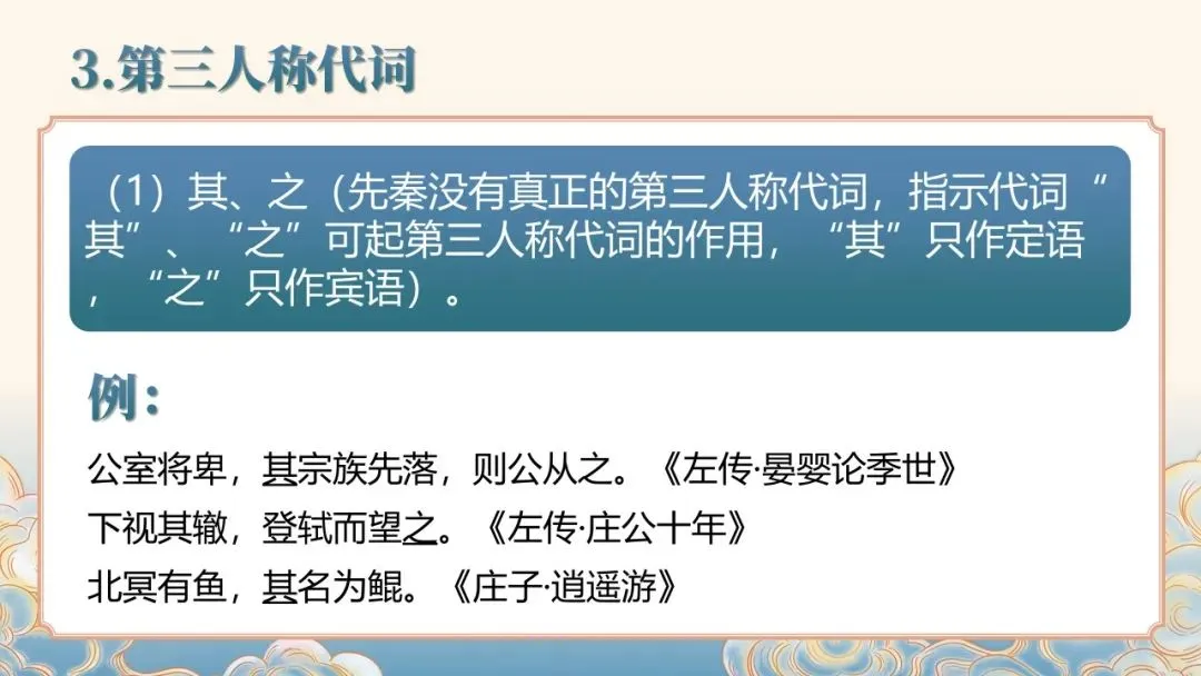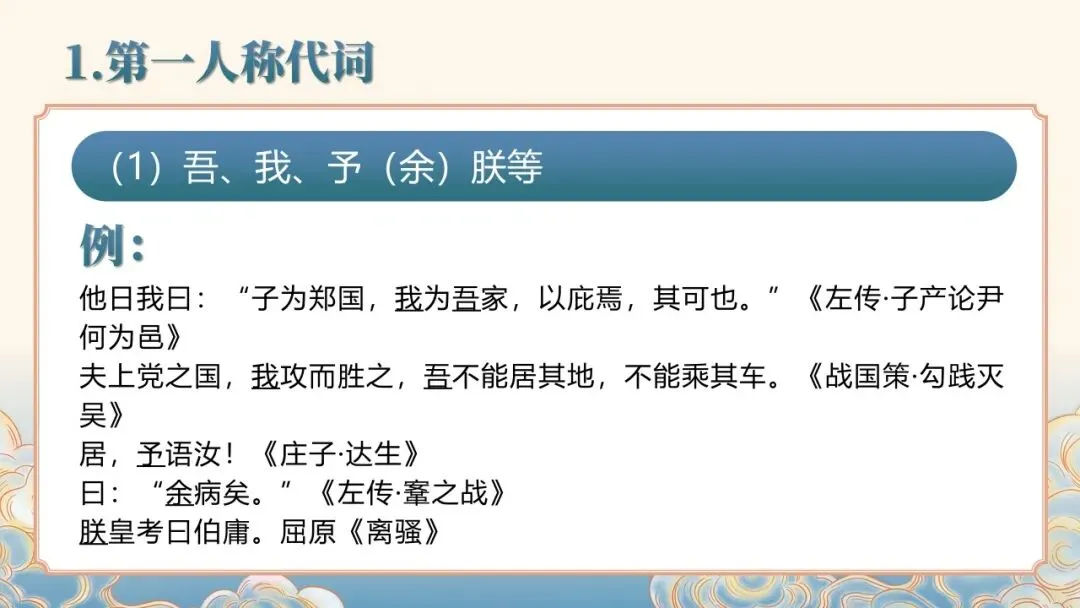 文言文常识课件聚焦文言文基础核心,详细讲解人称代词、指示代词、疑问代词等各类代词的用法,以及 “者”“所” 等辅助性代词的语法功能。通过典型例句示范,清晰呈现古代汉语代词的使用特点,如人称代词的单复数区分、谦称尊称的应用场景等,帮助学习者夯实文言文语法基础,提升对文言文中代词的理解与运用能力。