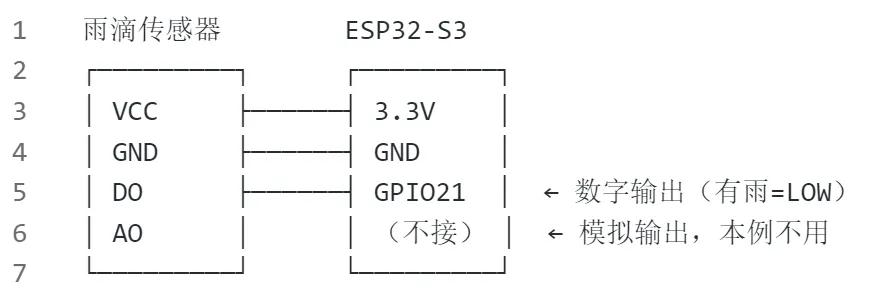 * GPIO21 → 雨滴传感器 DO (数字输出)