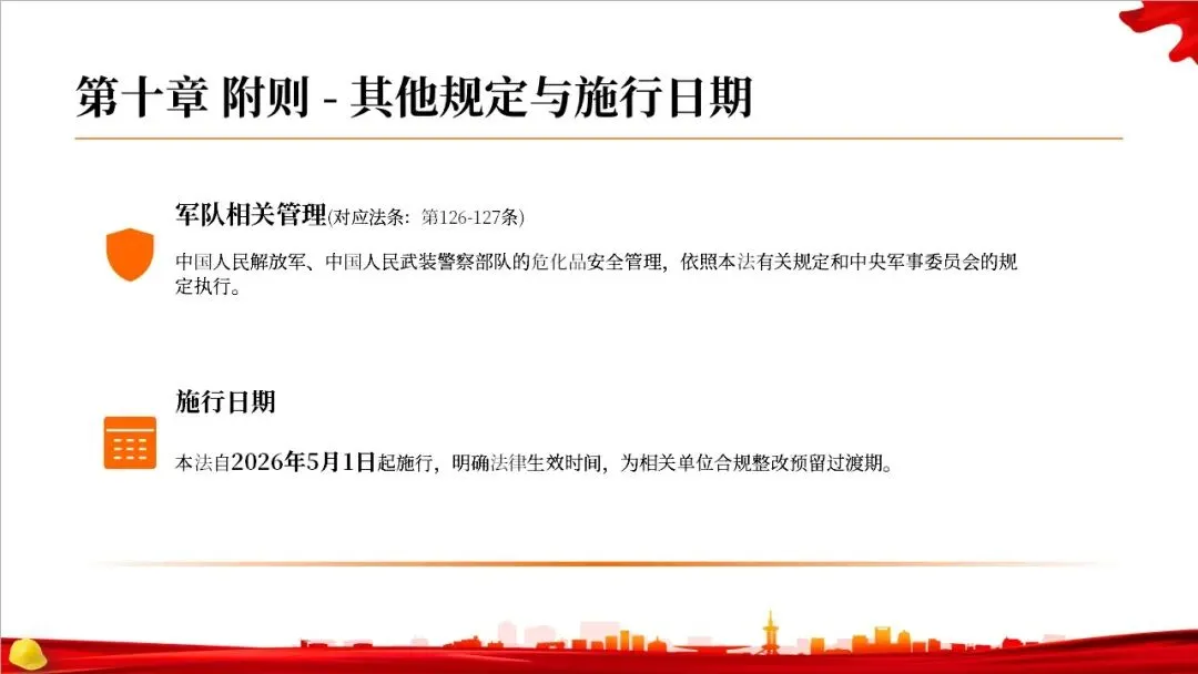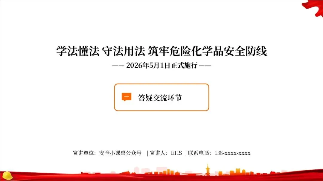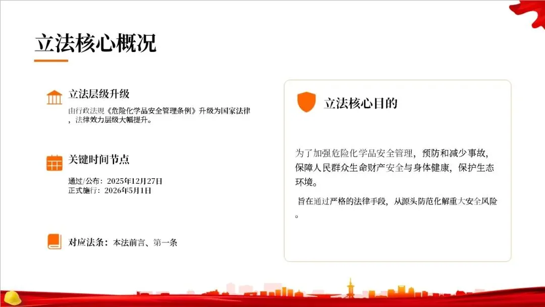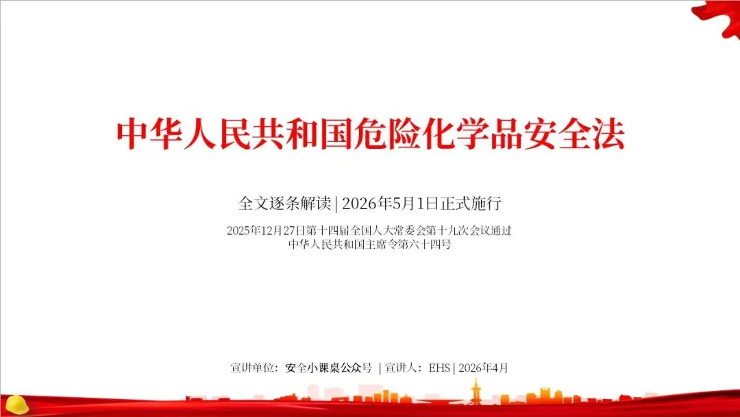 大家好,欢迎参加本次关于《中华人民共和国危险化学品安全法》的专题解读。这部法律将于2026年5月1日正式施行,它是我国危险化学品领域的第一部专门法律,标志着我国危化品安全治理进入了一个新的阶段。本次PPT将带领大家逐条解读这部法律的核心内容,帮助大家更好地理解和遵守。
