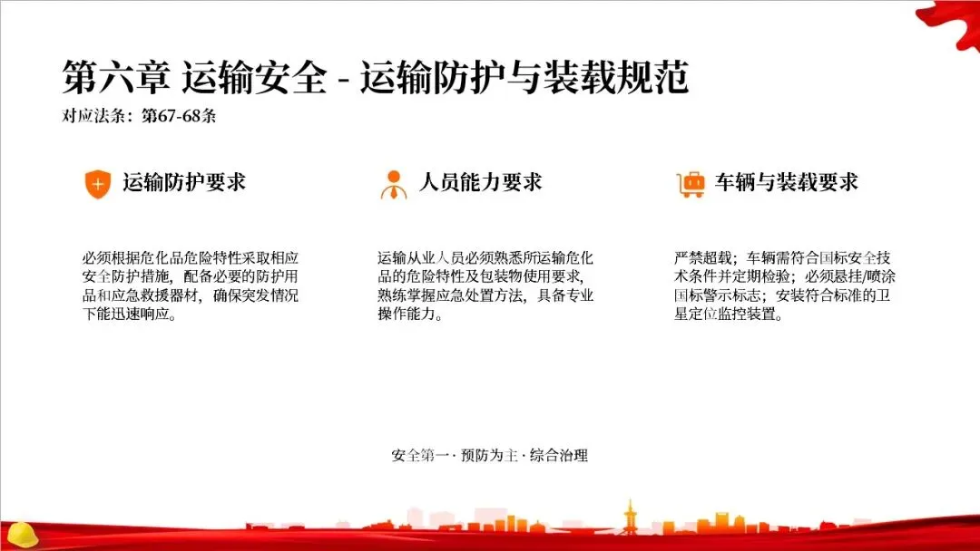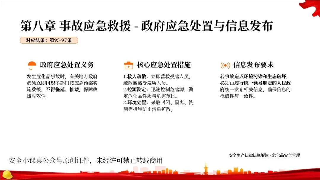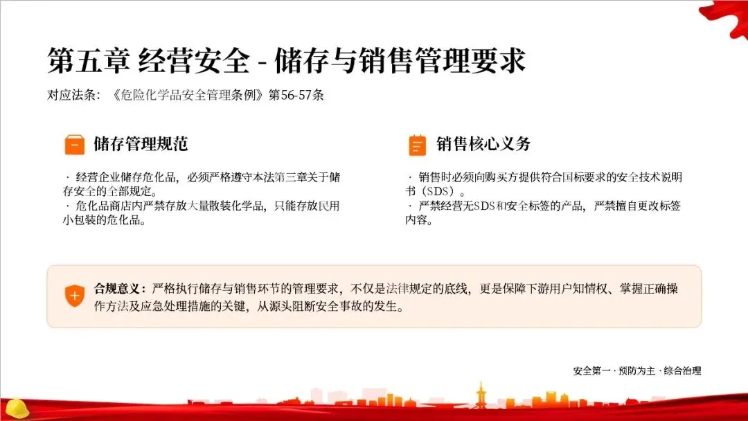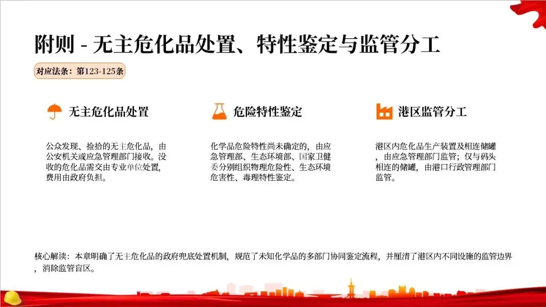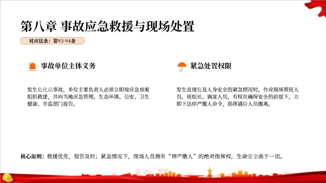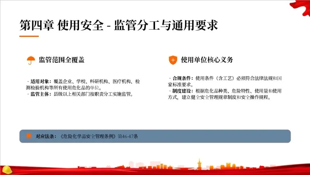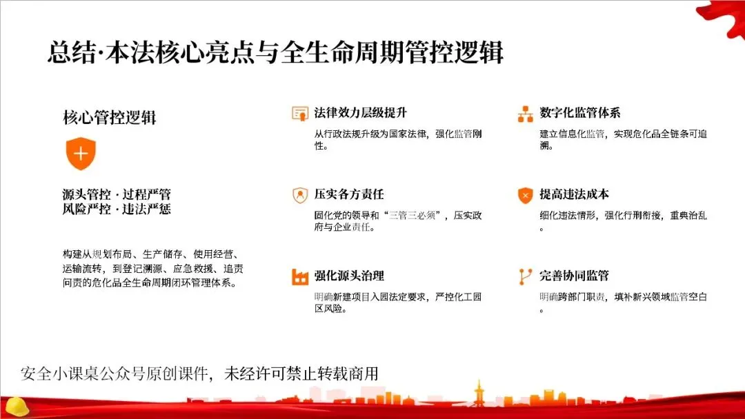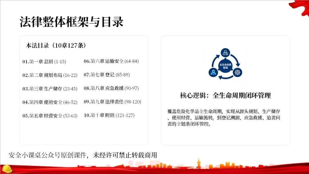 这部法律共分为10章,总计127条,构建了一个完整的危险化学品全生命周期管理体系。从最开始的规划布局,到生产、储存、使用、经营、运输,再到登记、应急救援和法律责任,每一个环节都有明确的规定,形成了一个闭环管理,确保危化品的安全贯穿始终。右侧的图示就很好地展示了这个全生命周期的管控逻辑。