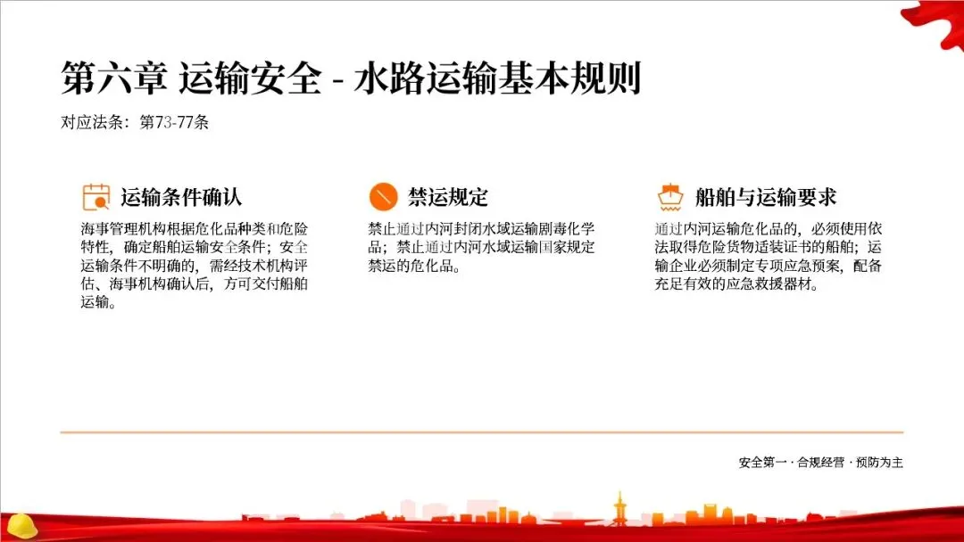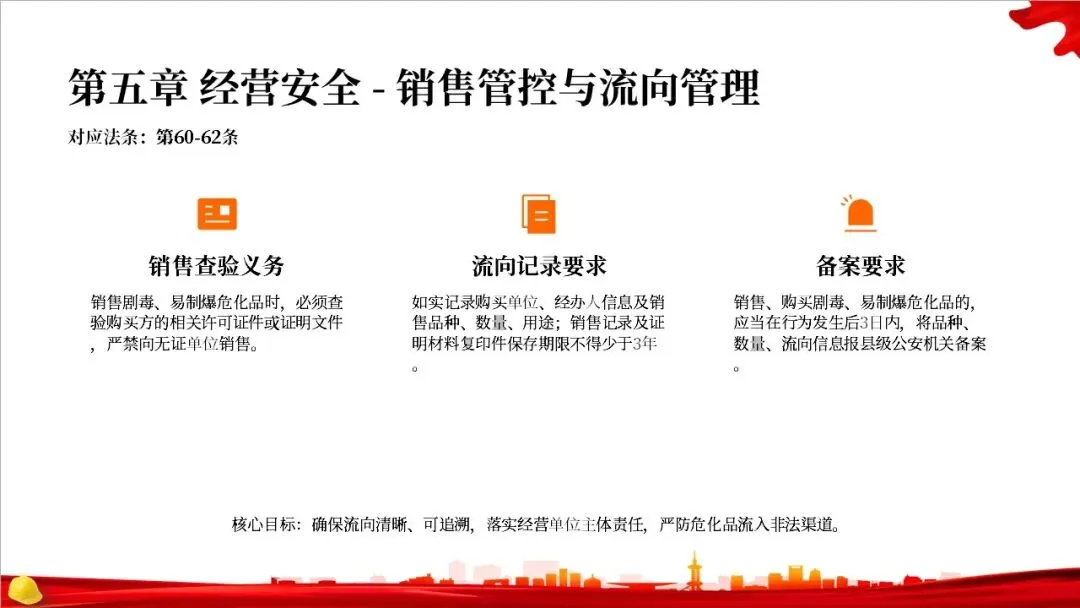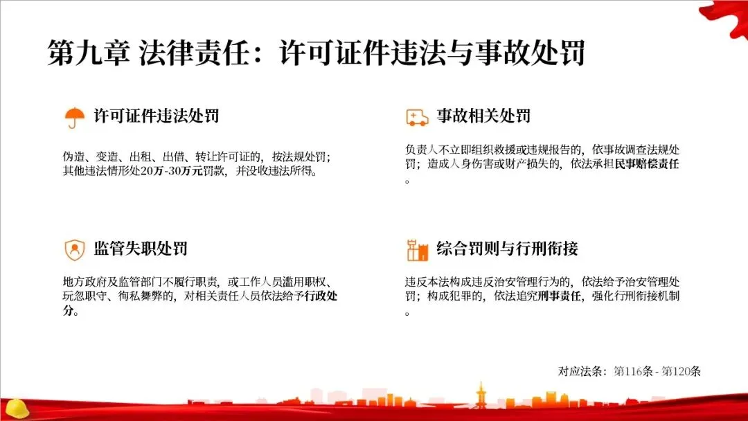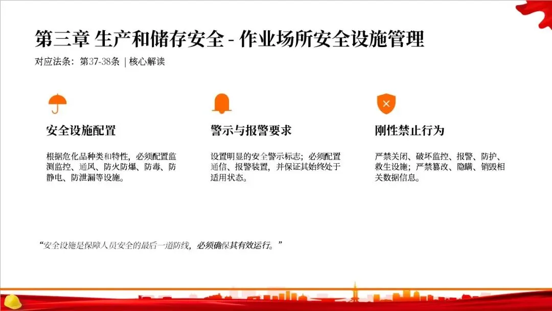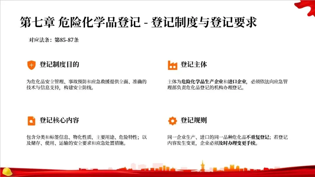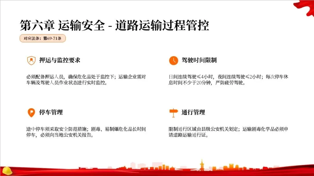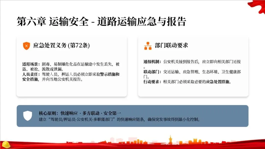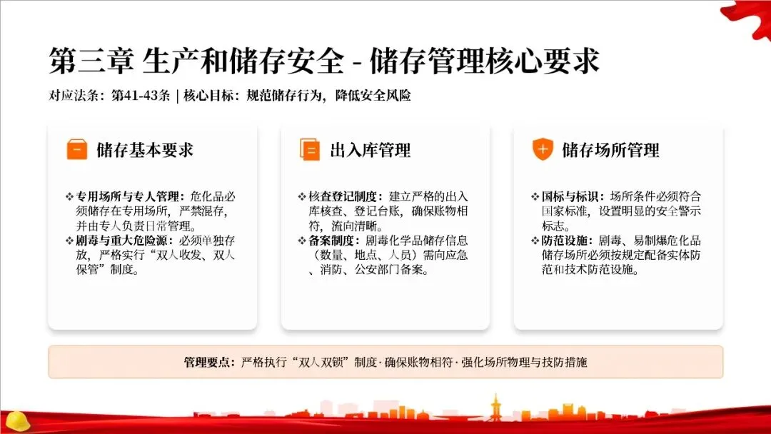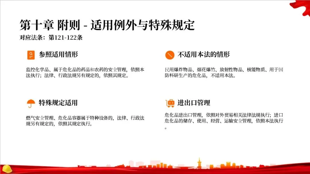 这部法律共分为10章,总计127条,构建了一个完整的危险化学品全生命周期管理体系。从最开始的规划布局,到生产、储存、使用、经营、运输,再到登记、应急救援和法律责任,每一个环节都有明确的规定,形成了一个闭环管理,确保危化品的安全贯穿始终。右侧的图示就很好地展示了这个全生命周期的管控逻辑。