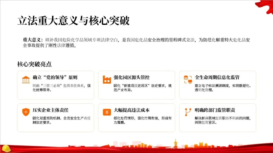 这部法律的出台具有重大意义,它填补了我国危化品领域专项法律的空白,是一个里程碑。它的核心突破主要体现在六个方面,比如强化了党的领导和监管责任,明确了化工园区的管控要求,建立了信息化追溯体系,压实了企业的主体责任,提高了违法成本,并明确了各部门的监管职责。这些亮点共同构成了一个更全面、更严格的监管体系。