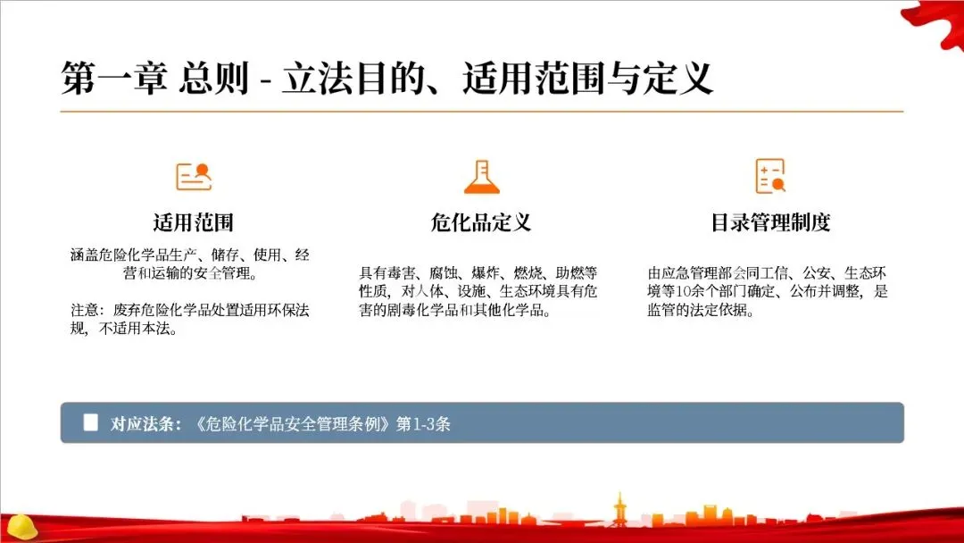 现在我们进入第一章总则的学习。首先是立法目的、适用范围和定义。法律明确了它适用于危化品的生产、储存、使用、经营和运输环节,但废弃处置则遵循环保法规。同时,法律对危险化学品给出了明确的定义,并建立了由多部门联合管理的目录制度,这是所有监管工作的基础。