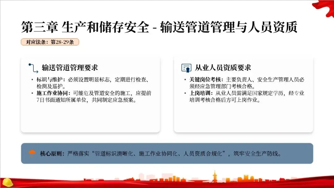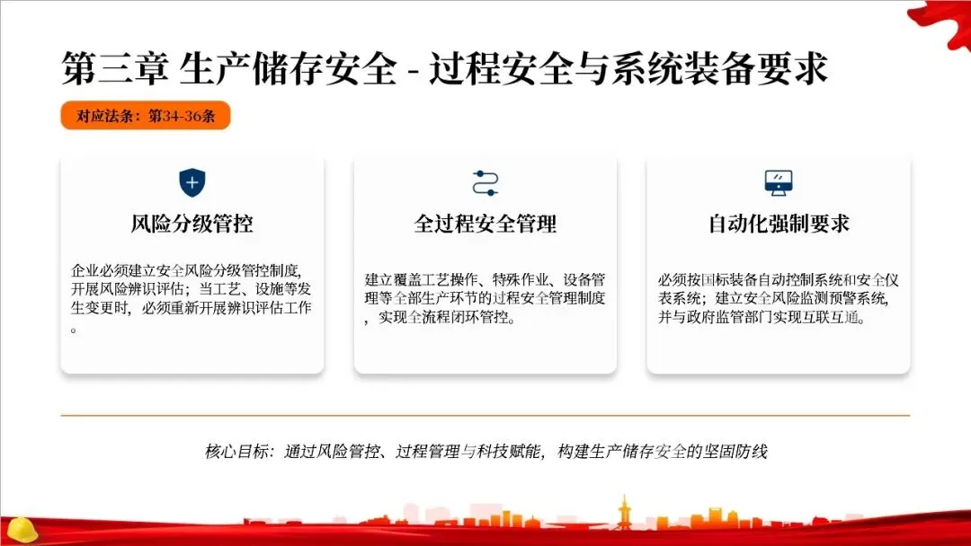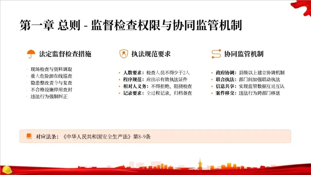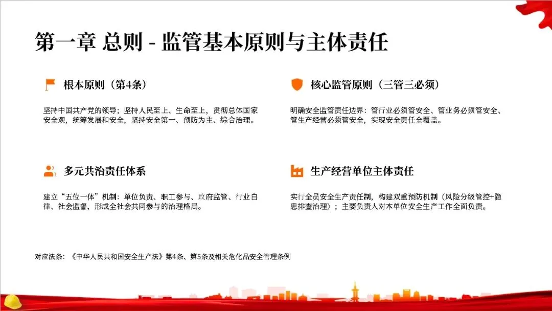 总则部分还确立了监管的基本原则和责任体系。根本原则是坚持党的领导和人民至上。核心监管原则是“三管三必须”,明确了各个层面的安全责任。同时,法律强调了企业的主体责任,要求企业建立全员安全生产责任制和双重预防机制,主要负责人要对安全工作全面负责。