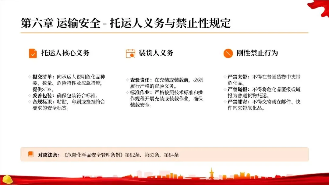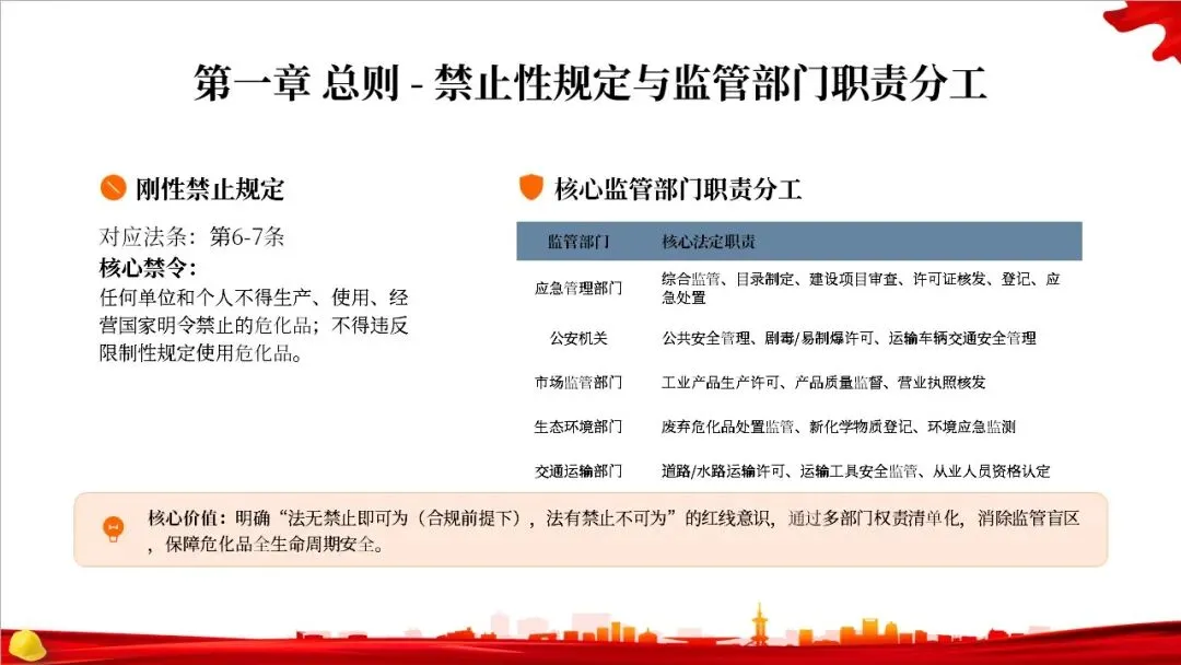 法律明确了一些刚性的禁止性规定,比如禁止生产、使用和经营国家明令禁止的危化品。同时,对各监管部门的职责进行了清晰的分工,比如应急管理部门负责综合监管和许可证核发,公安机关负责公共安全和剧毒化学品管理,市场监管部门负责产品质量,生态环境部门负责废弃处置,交通运输部门负责运输安全。这样的分工明确了责任,避免了监管空白。