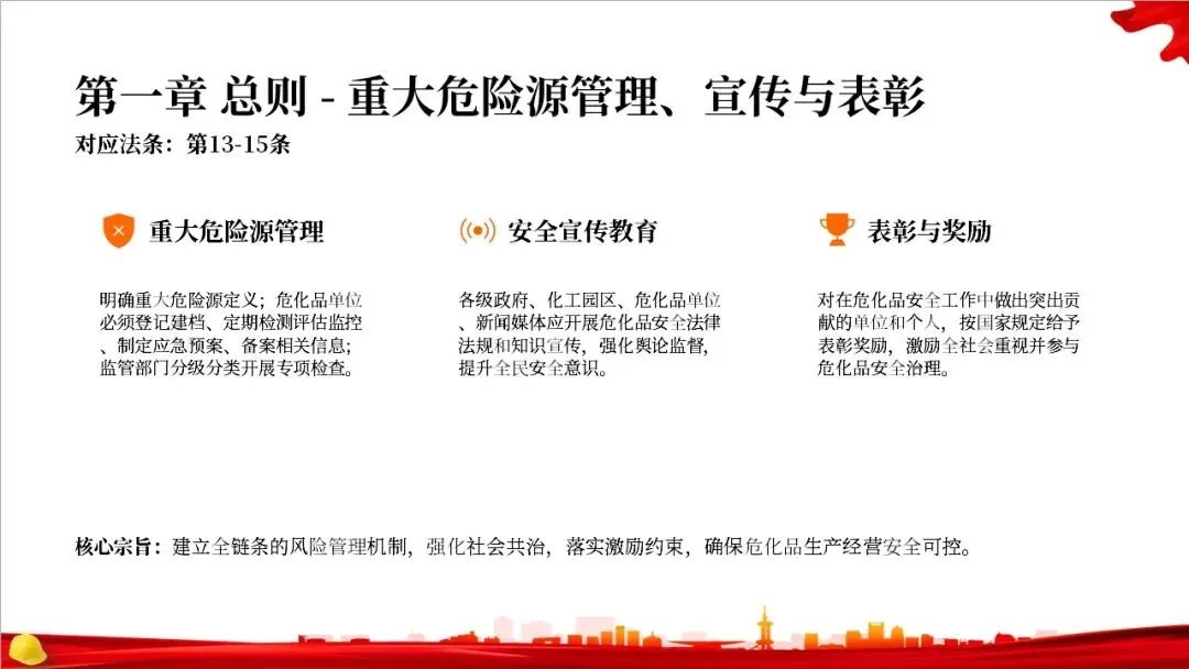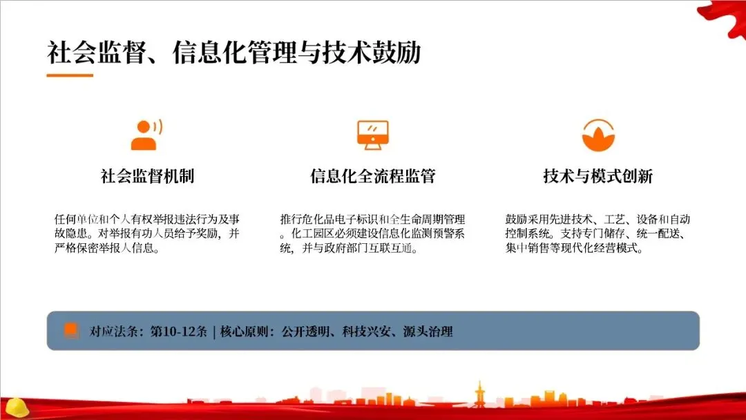 总则还引入了社会监督机制,鼓励公众举报违法行为,并给予奖励。同时,大力推进信息化监管,要求建立电子标识和全生命周期管理系统,化工园区也必须建设信息化监测预警系统。此外,法律还鼓励企业采用先进技术和设备,提升安全水平。