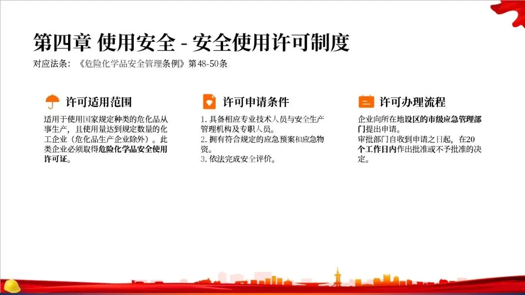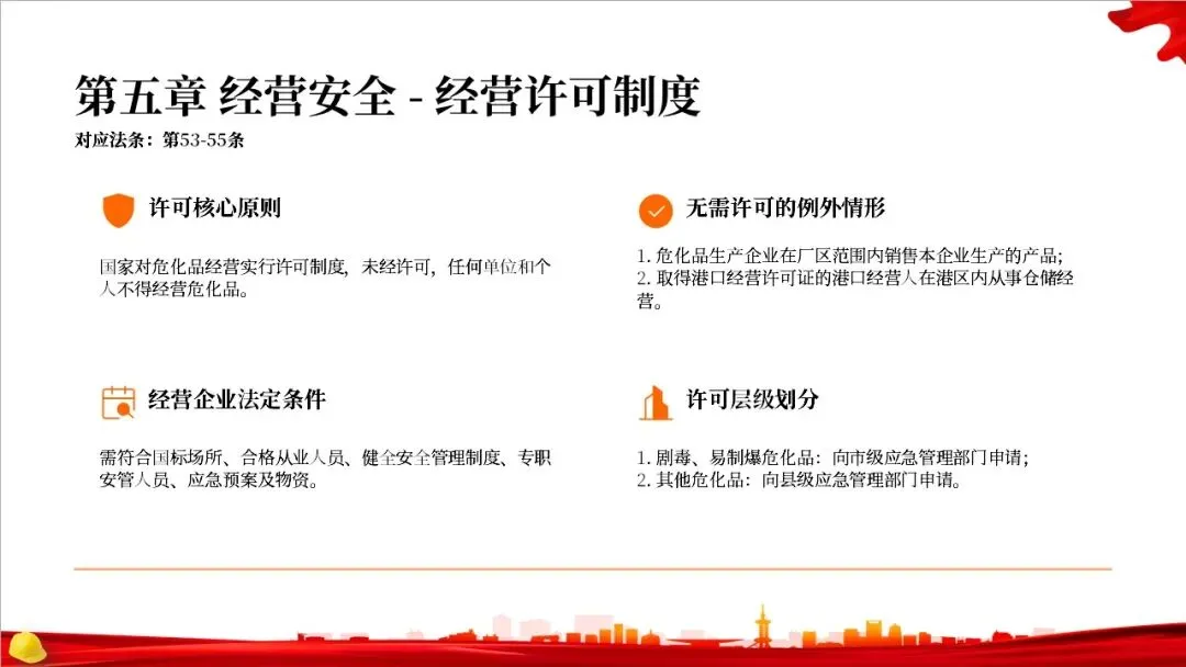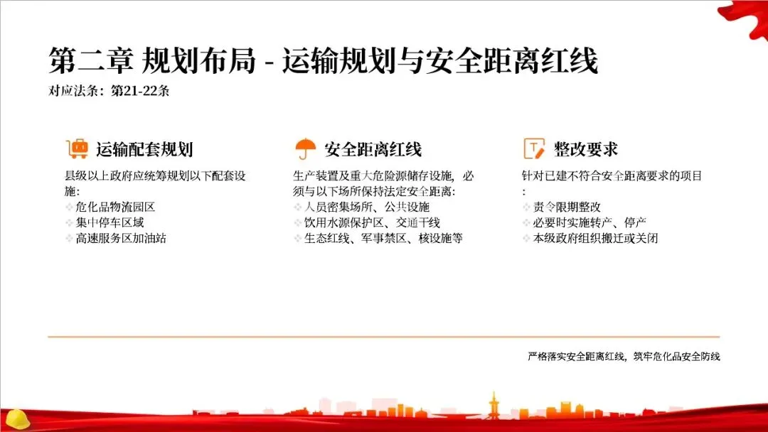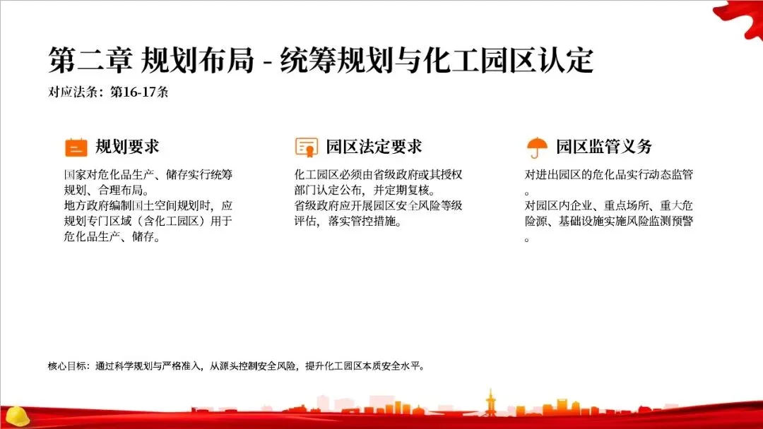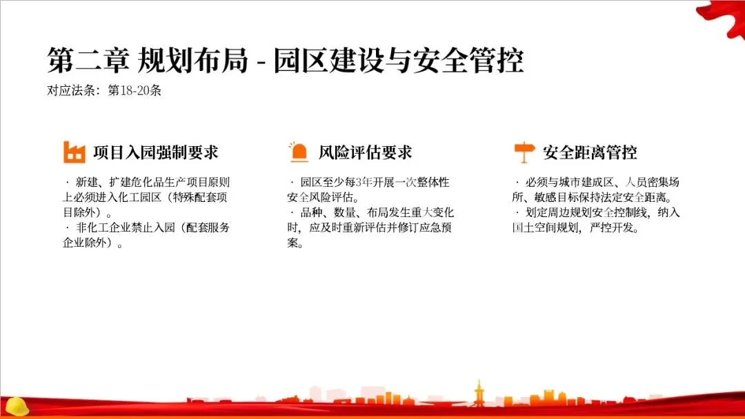 第二章是关于规划布局的规定。法律要求国家对危化品的生产和储存进行统筹规划,地方政府在国土空间规划中要专门划出区域用于危化品相关产业。特别重要的是,化工园区必须经过省级政府的认定和定期复核,并开展安全风险评估,以从源头上控制风险。