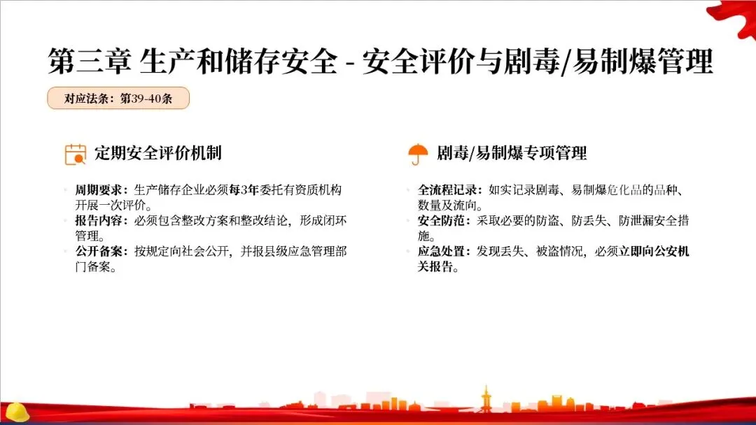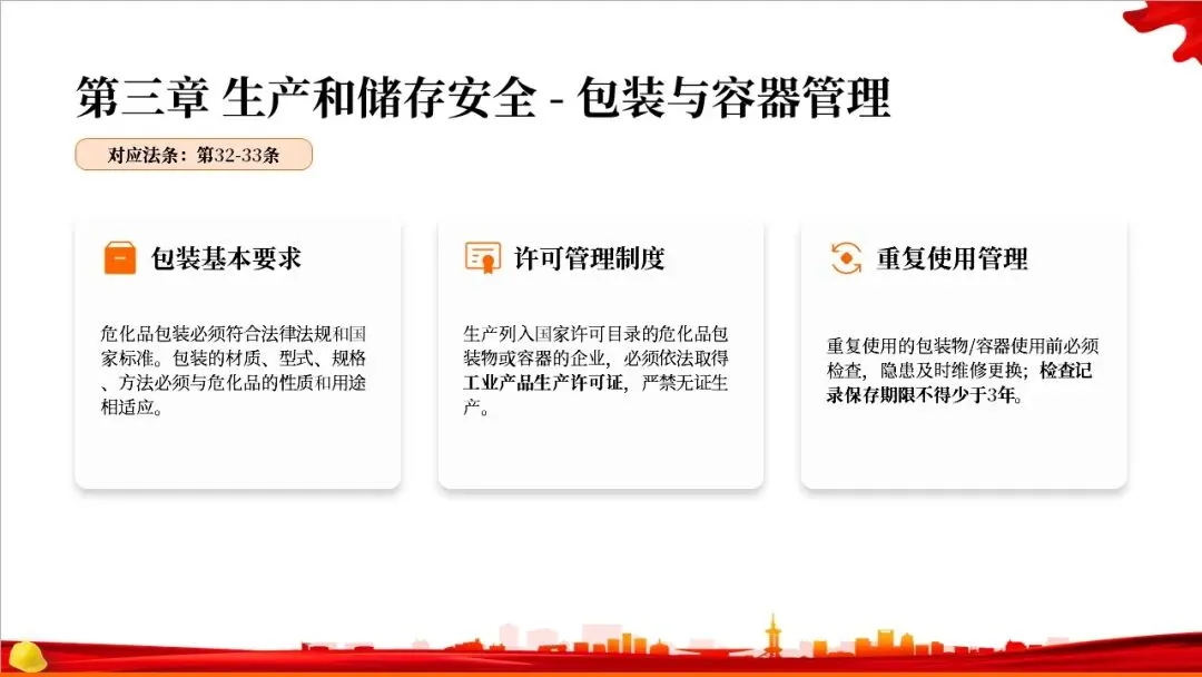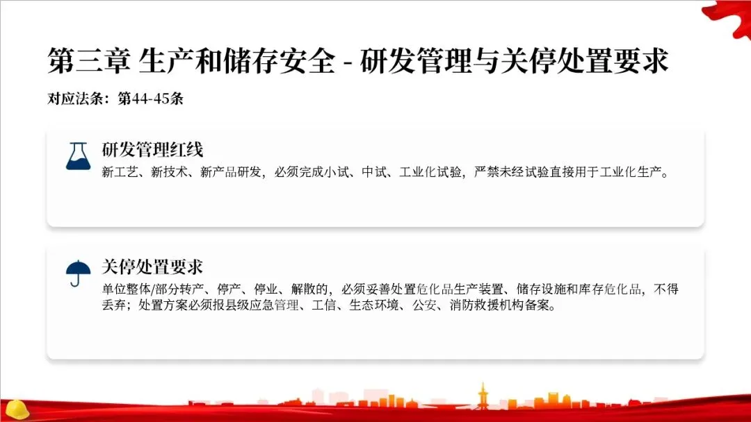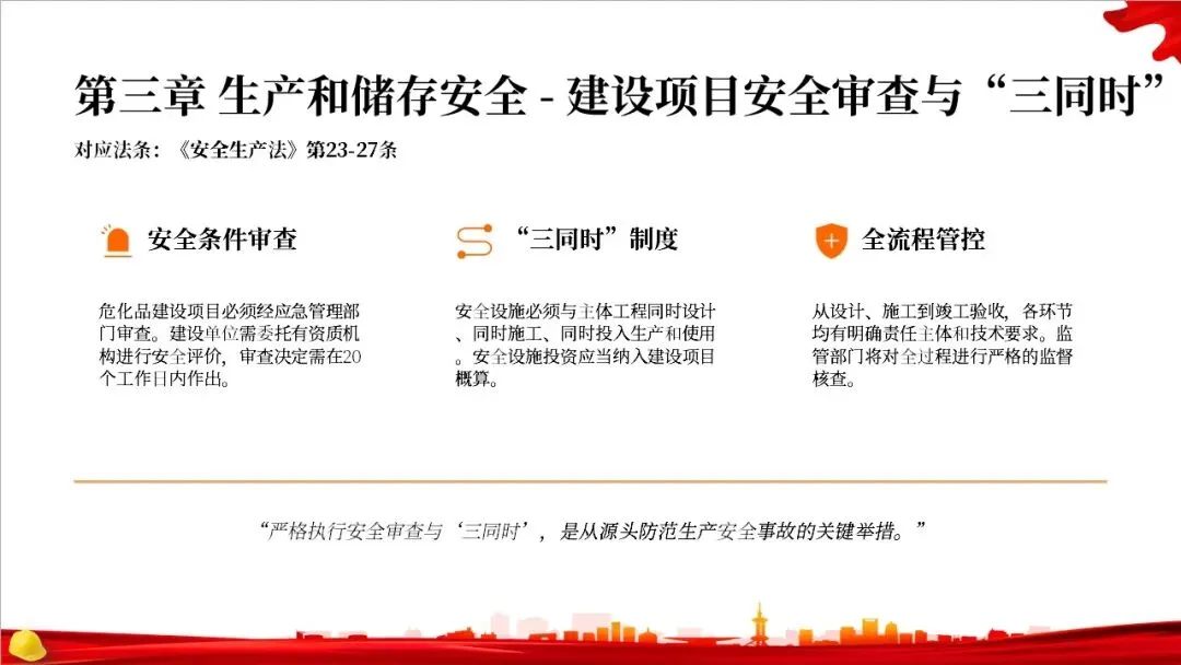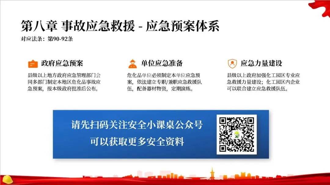 第二章是关于规划布局的规定。法律要求国家对危化品的生产和储存进行统筹规划,地方政府在国土空间规划中要专门划出区域用于危化品相关产业。特别重要的是,化工园区必须经过省级政府的认定和定期复核,并开展安全风险评估,以从源头上控制风险。
