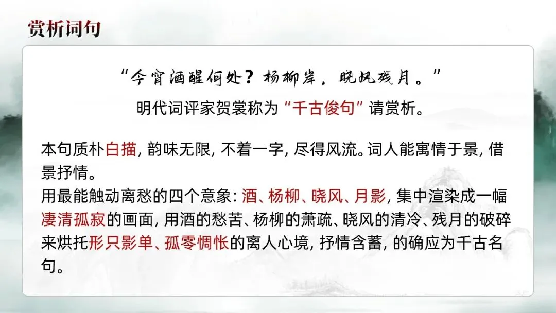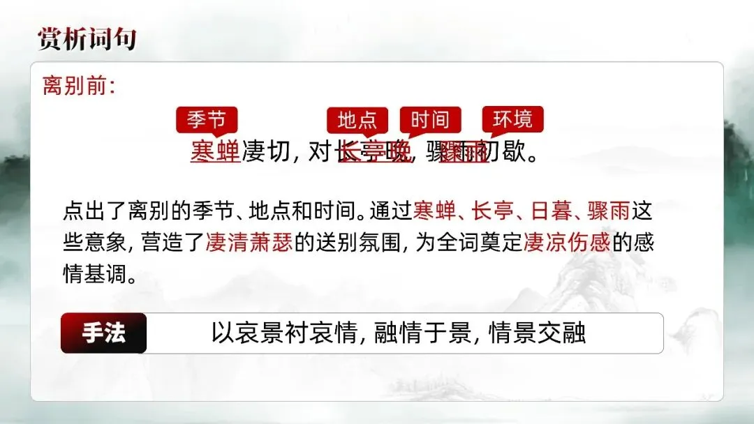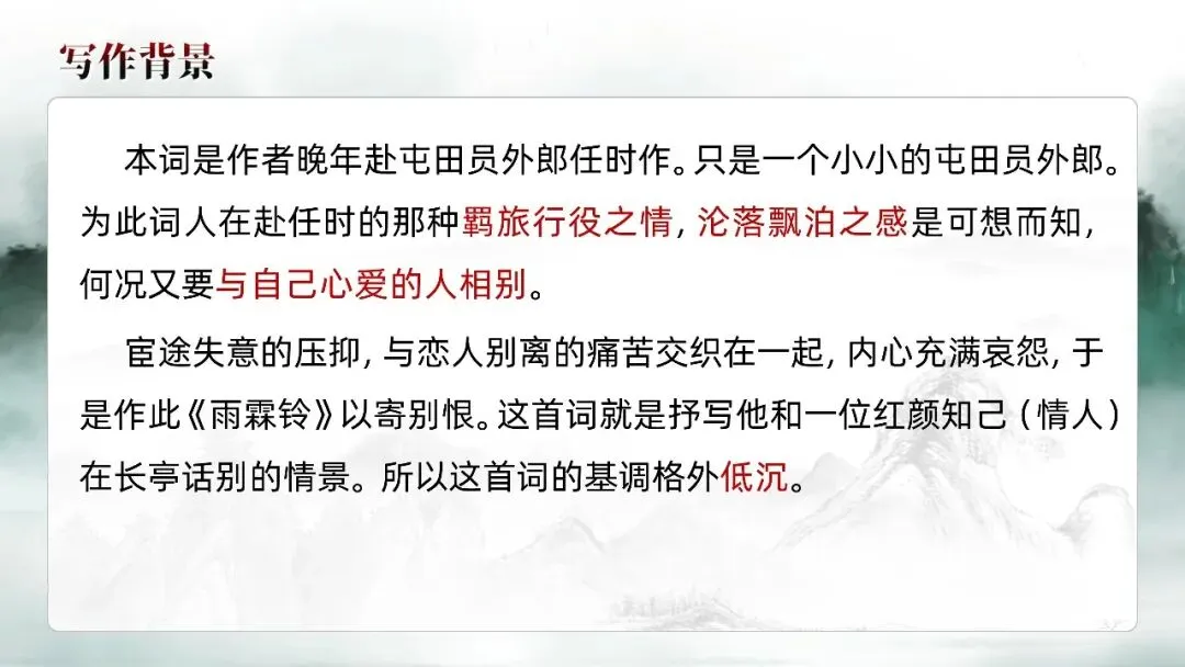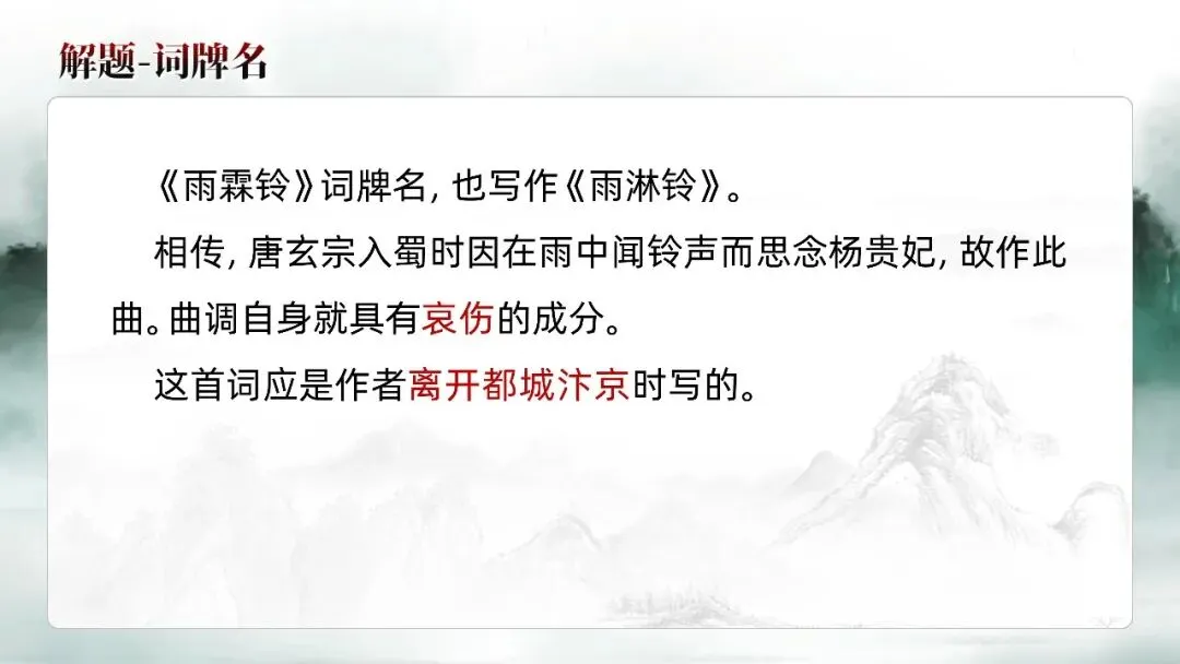 本期更新的课件为统编高教社版中职语文职业模块古诗词诵读单元《雨霖铃(寒蝉凄切)》,课件共20页。