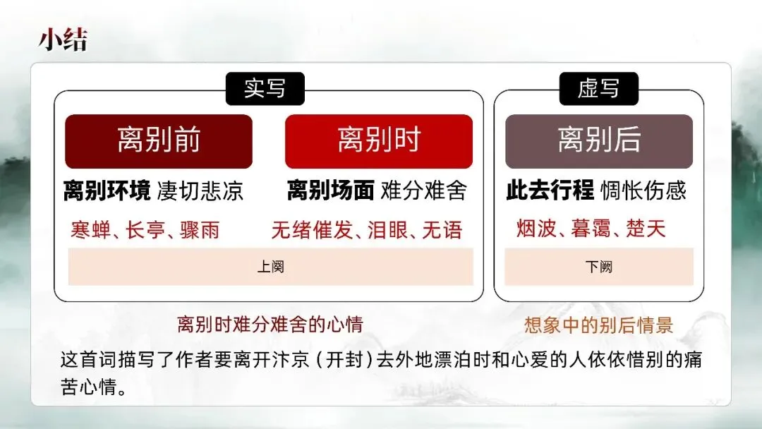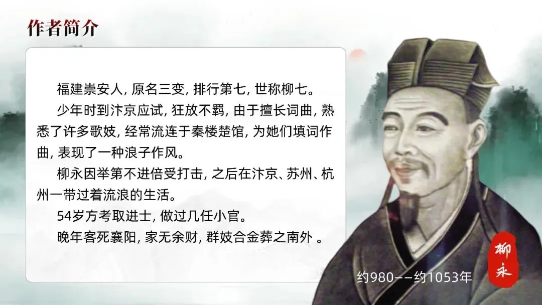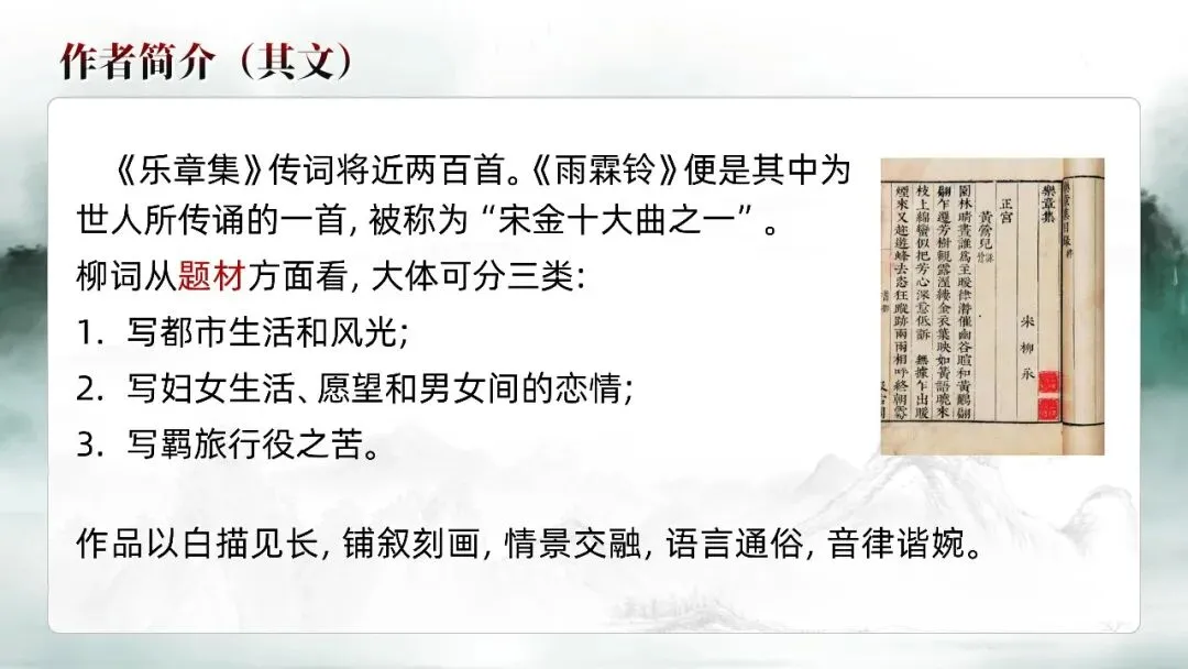 本文是北宋词人柳永的代表作。词作以秋景写离情,"寒蝉凄切,对长亭晚,骤雨初歇"渲染凄凉氛围,"执手相看泪眼,竟无语凝噎"刻画难舍之态,"杨柳岸,晓风残月"设想别后孤寂。全词情景交融,音律婉转,将羁旅之愁与离别之苦抒发得淋漓尽致,是婉约词派的典范之作,对宋元戏曲影响深远。