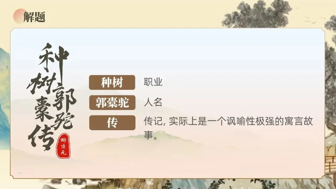 本文是唐代柳宗元的寓言散文名篇。文章借种树能手郭橐驼"顺木之天,以致其性"的养树之道,讽喻官吏繁政扰民的社会现实,提出"养人"应如"养树",需顺应民性、休养生息的政治主张。全文托物言志,对比鲜明,"虽曰爱之,其实害之;虽曰忧之,其实仇之"的警示,体现了柳宗元作为唐宋八大家之一的深刻洞察力与民本思想。